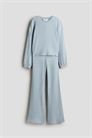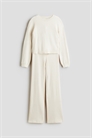 Комплект из джемпера и брюк из мягкого трикотажа в рубчик. Джемпер с круглым вырезом, отделанным ребрами, спущенными плечами и длинными рукавами. Ребра на манжетах и подоле. Расклешенные брюки с эластичной отделкой и декоративным шнурком на талии.