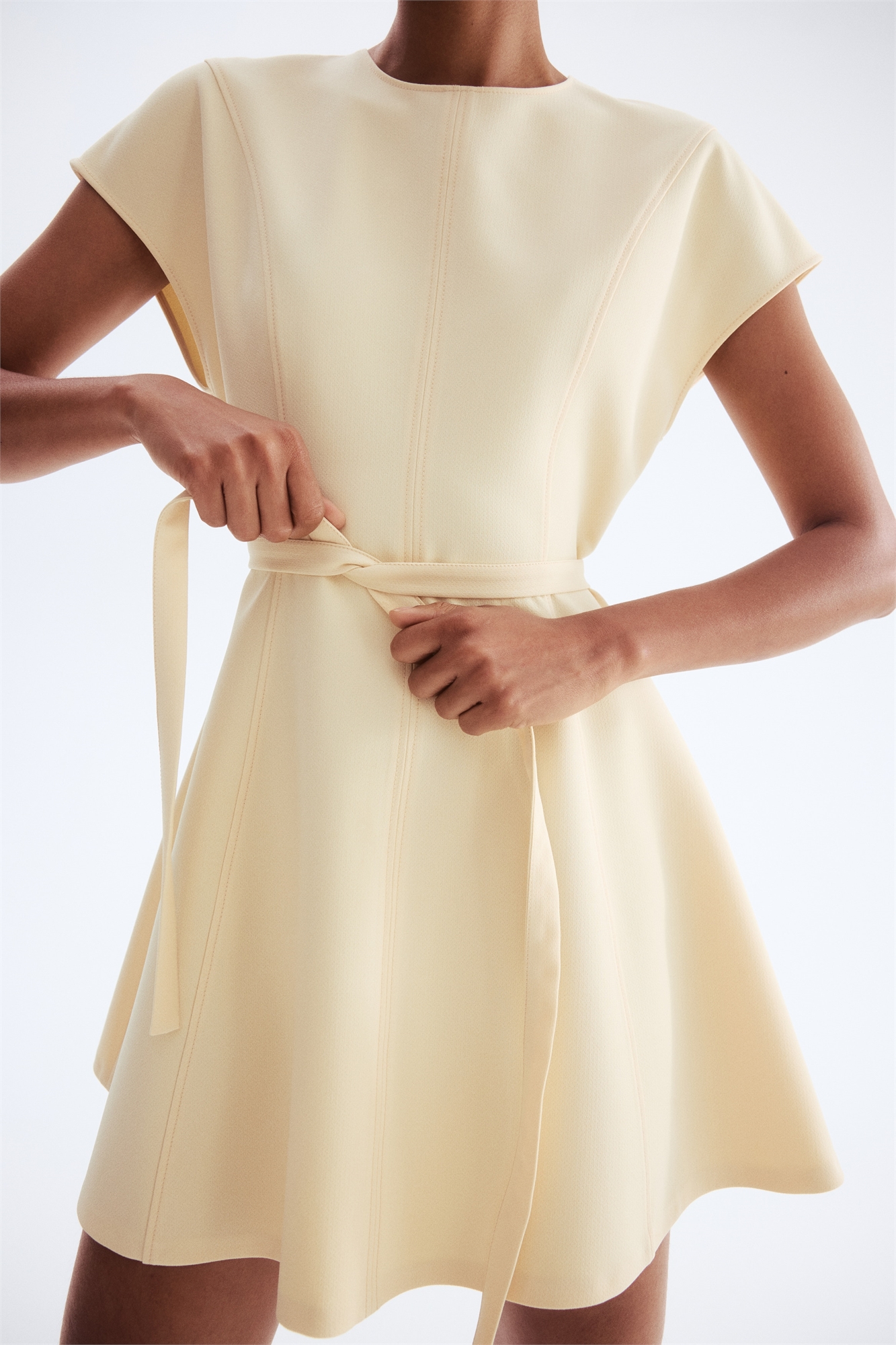 Короткое платье из тканого материала с круглым вырезом, потайной застежкой-молнией сзади и короткими рукавами. Формообразующие швы спереди и сзади, съемный пояс с завязками на талии и слегка расклешенная юбка для придания стройности силуэту. Без подкладки.