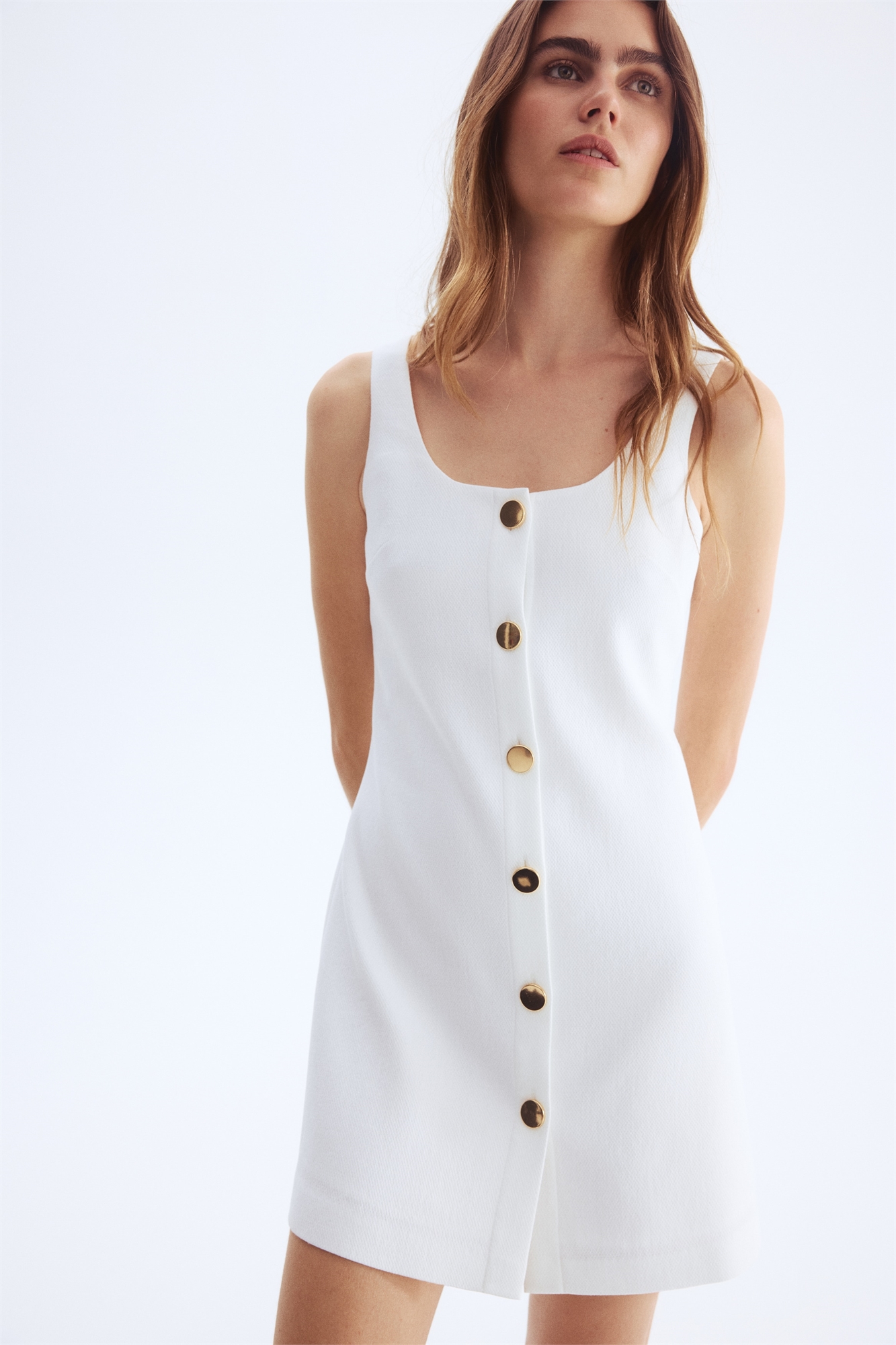 Короткое платье без рукавов из тканого материала с вырезом-лодочкой спереди и сзади. Облегающий крой с нагрудными вытачками и металлическими пуговицами спереди. На подкладке.