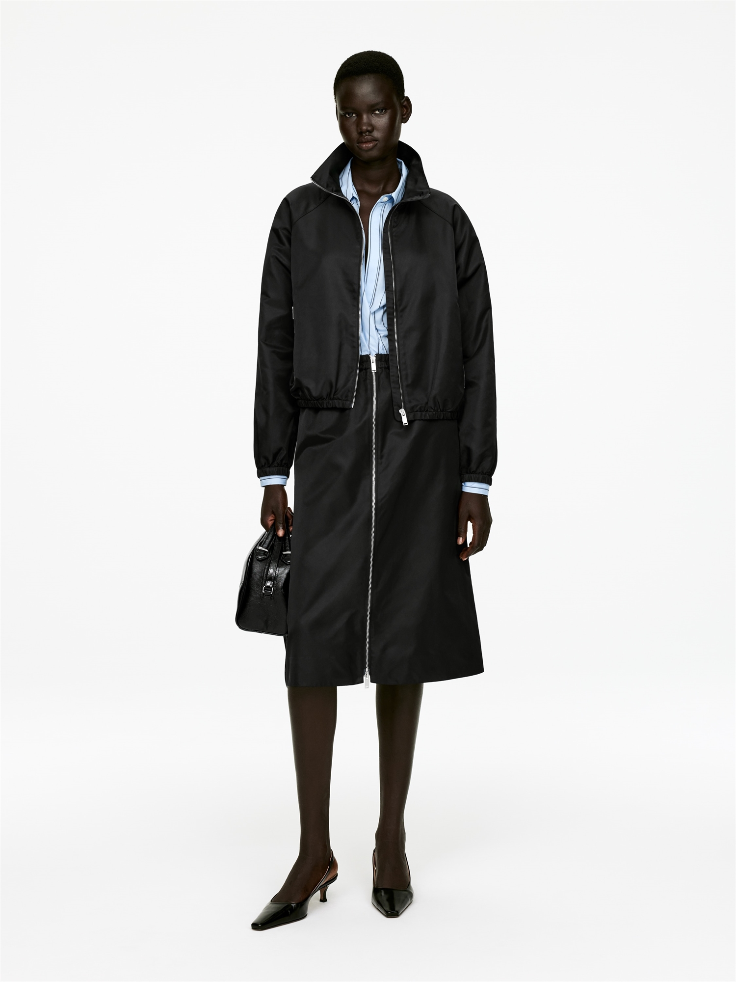 Спортивная куртка из нейлона с металлической застежкой-молнией и эластичными манжетами по подолу и низу.
