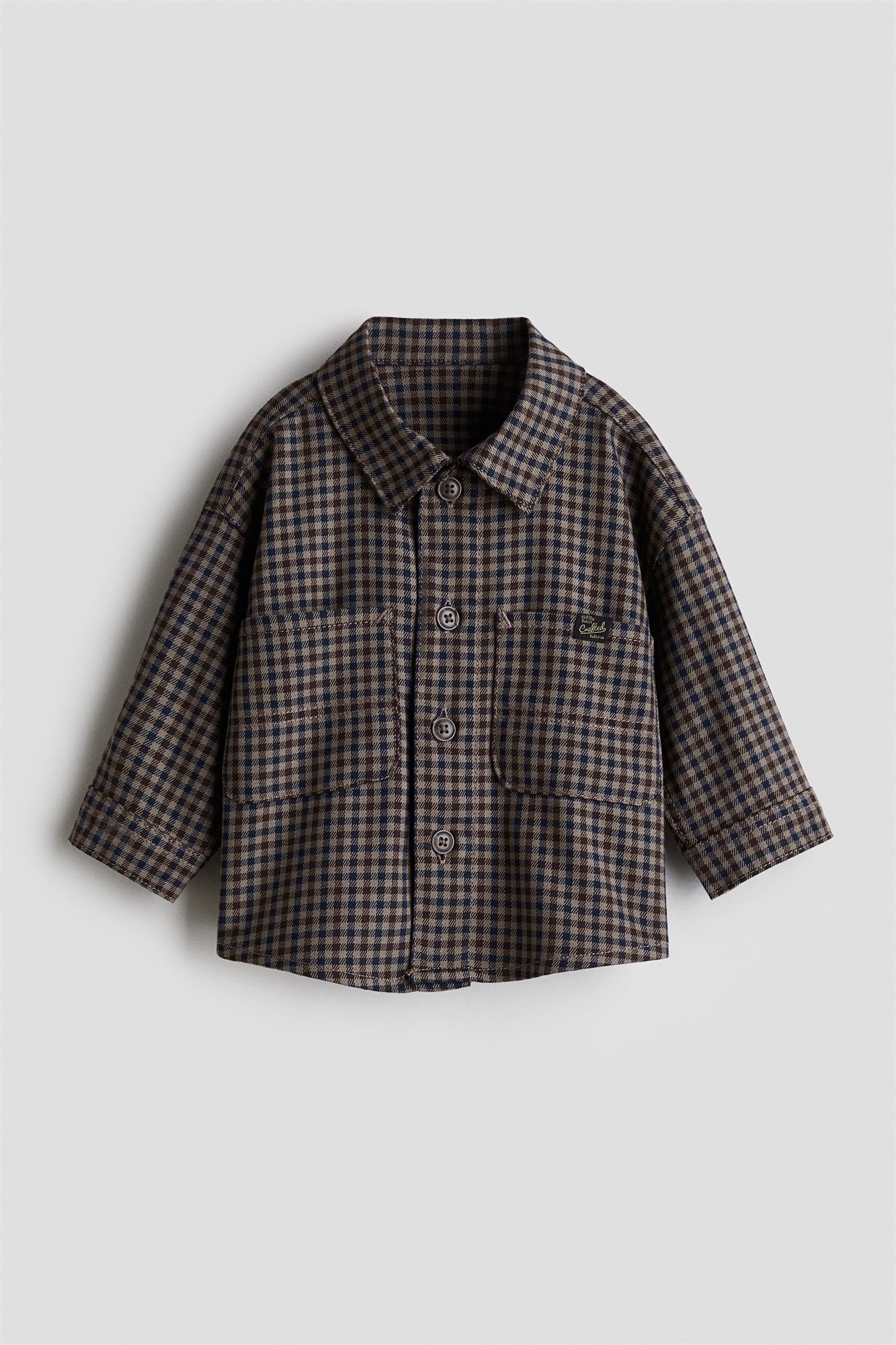 Рубашка из мягкой саржи с воротником, пуговицами спереди и открытыми нагрудными карманами. Спущенные плечи, длинные рукава с манжетами на пуговицах и слегка закругленный подол.