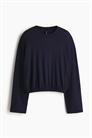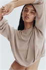 Топ оверсайз из джерси с круглым вырезом с ребристой отделкой, спущенными плечами и длинными рукавами. Сборки и эластичная резинка на подоле.