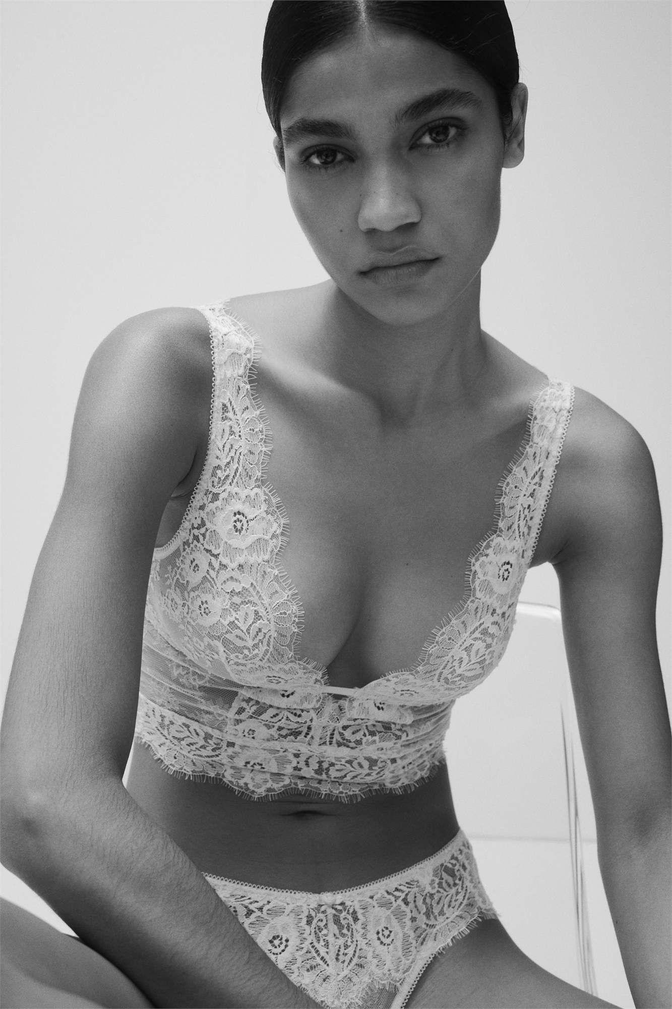 Бралетт из кружева с глубоким V-образным вырезом спереди и сзади и чашечками без подкладки, которые придают бюсту естественную форму и обеспечивают легкую поддержку. Отверстие для ключа и узкая застежка-крючок сзади.