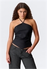 Топ с горловиной халтер и облегающим силуэтом. Созданный из костюмной ткани, он имеет заостренный подол, аккуратные подгибы по краям и потайную застежку-молнию сбоку. Тонкие бретели, завязывающиеся сзади, позволяют регулировать посадку.