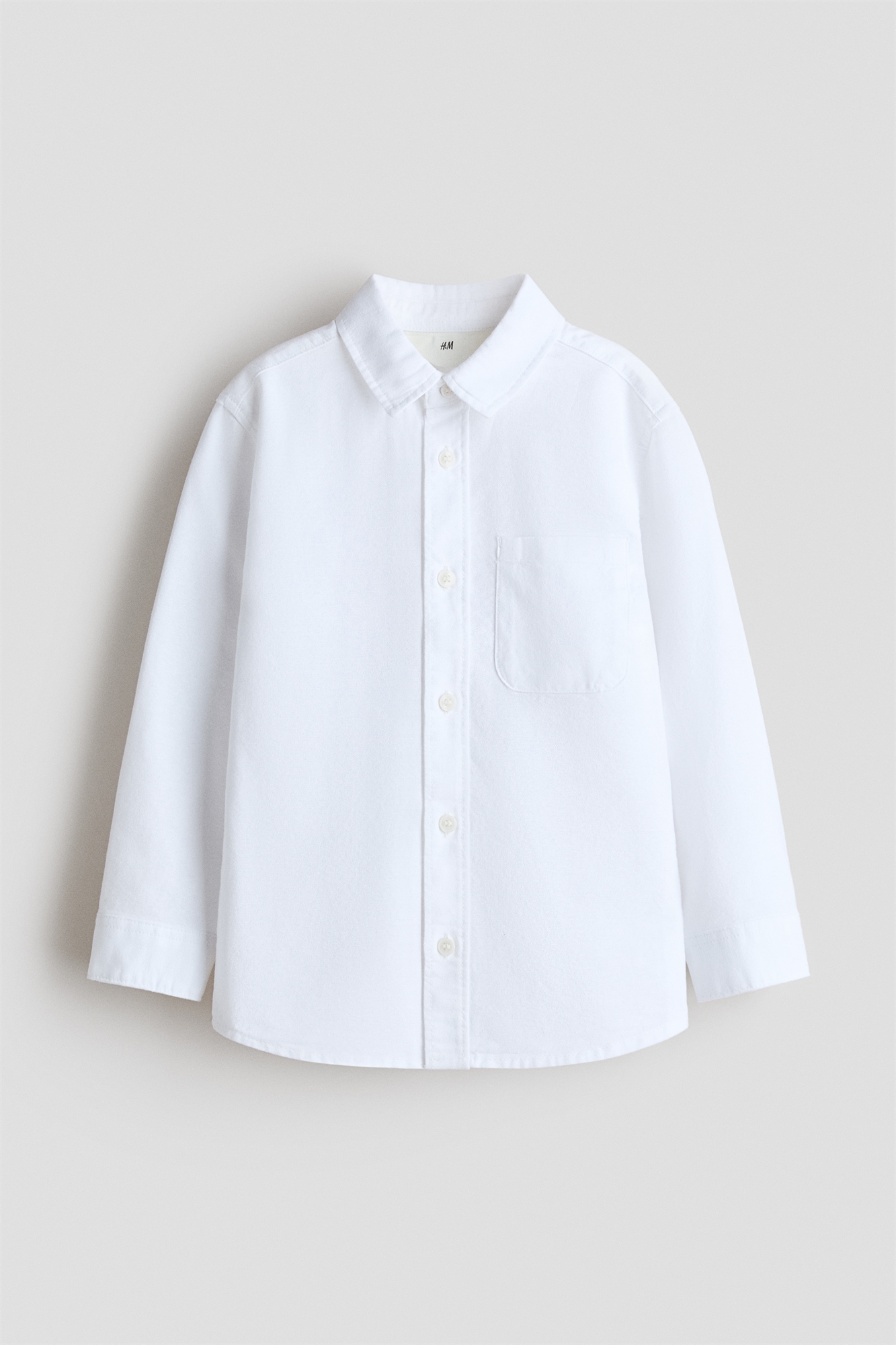 Рубашка из хлопкового полотна с отложным воротником, пуговицами спереди и накладным нагрудным карманом. Длинные рукава с манжетами на пуговицах и складками сзади. Закругленный подол.