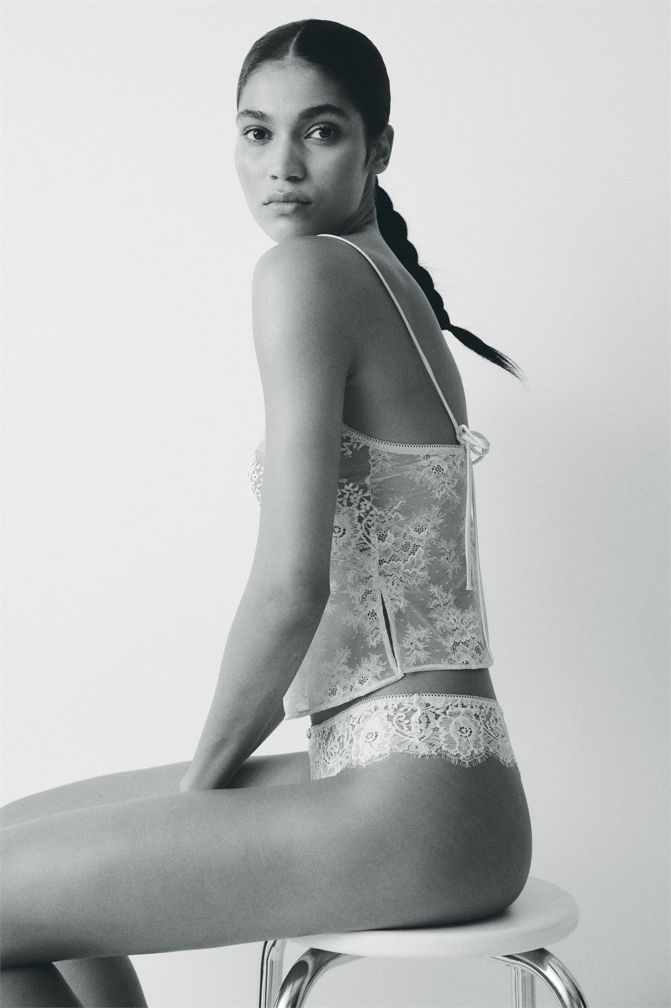 Трусы-стринги из кружева с заниженной V-образной талией и ластовицей.