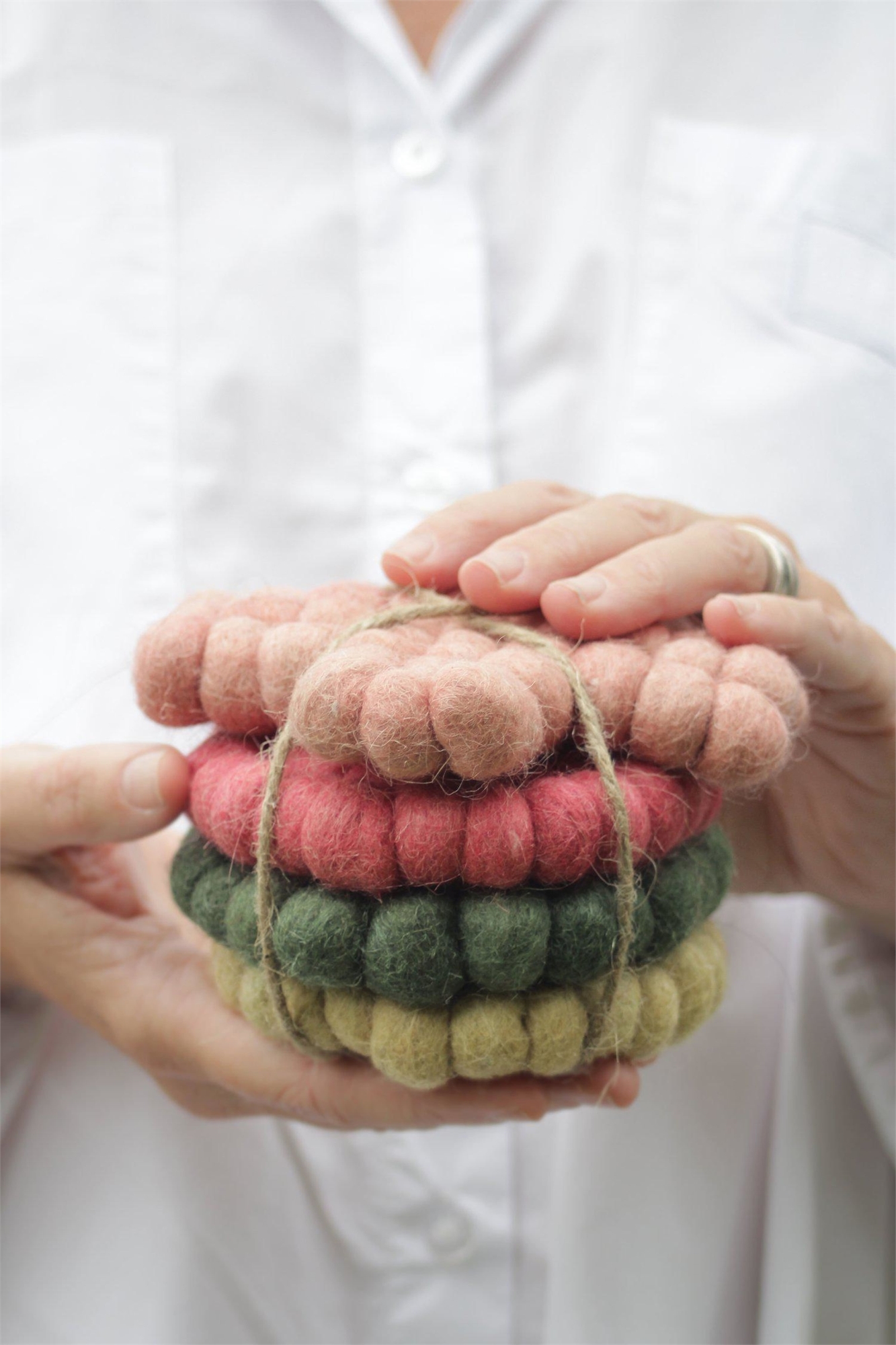 Подставки из шерсти для защиты поверхности стола. Диаметр каждой подставки - 10 см. Продаются в упаковке по 4 штуки.
