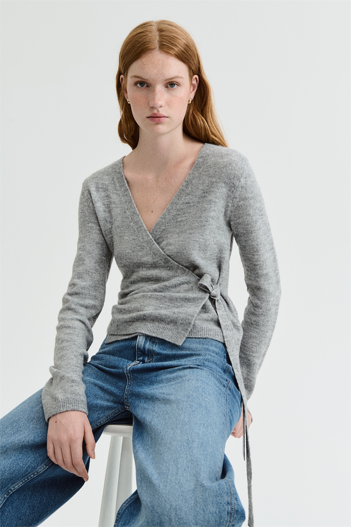 Короткий приталенный кардиган из мягкого трикотажа с V-образным вырезом горловины и облегающим передом с широкими завязками с одной стороны. Длинные рукава и завязки на манжетах и подоле.