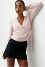 Короткий приталенный кардиган из мягкого трикотажа с V-образным вырезом горловины и облегающим передом с широкими завязками с одной стороны. Длинные рукава и завязки на манжетах и подоле.