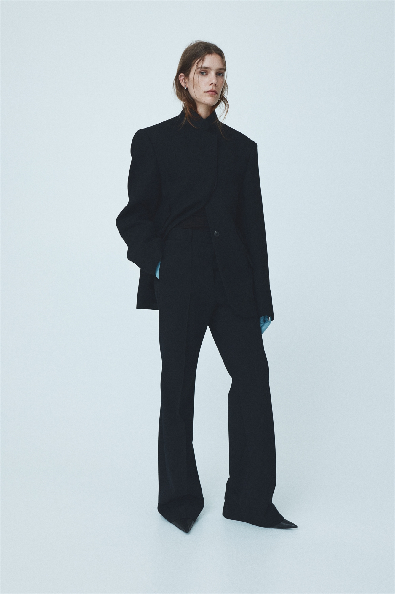 Брюки из шерстяной смеси с заниженной талией, ширинкой на молнии и удлиненным поясом со скрытой пуговицей и застежкой на крючок и планку. Диагональные боковые карманы и прорезной задний карман на пуговице.Заниженная промежность и облегающие ноги с пришитыми складками спереди и заутюженными складками сзади. Удлиненная длина, рассчитанная на ногу.