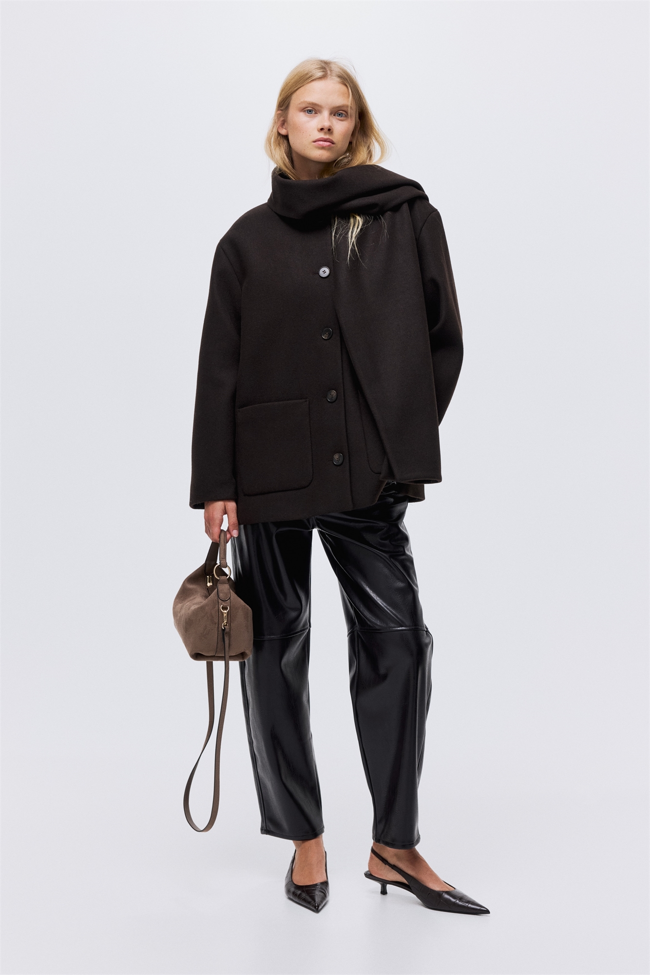 Пальто из тканого материала с отстегивающимся шарфом для различных вариантов укладки. Круглый вырез, застежка на пуговицы спереди, накладные передние карманы и спущенные плечи. Подол прямого кроя с коротким разрезом с каждой стороны. На подкладке.