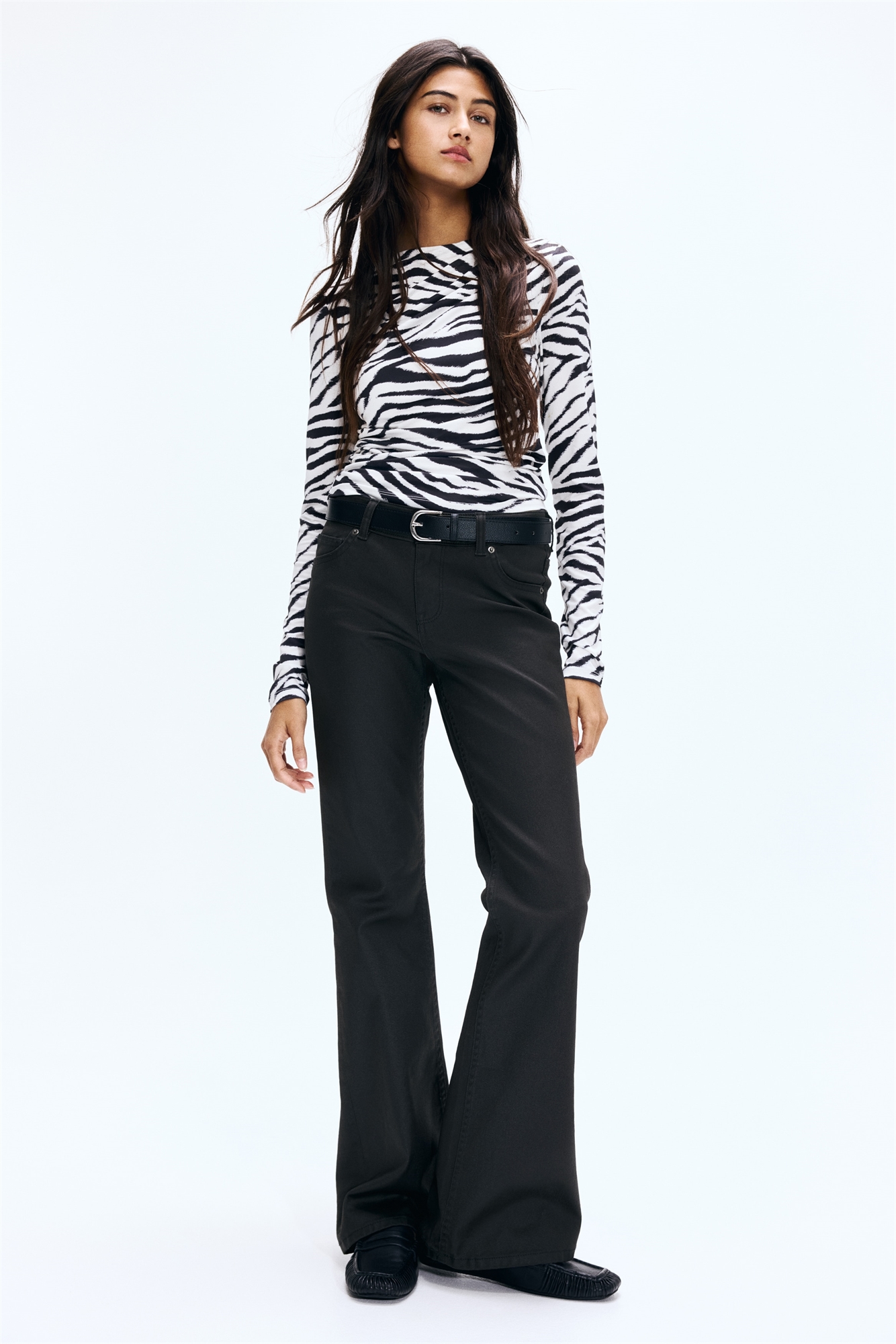 Джинсы с 5 карманами из тканого материала, заниженной талией, ширинкой на молнии и пуговице. Зауженный крой с расклешенными ногами.