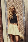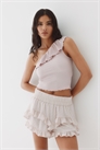 Короткий приталенный топ на одно плечо из фактурного джерси с оверлоком по краям и широким воланом по верхнему краю.