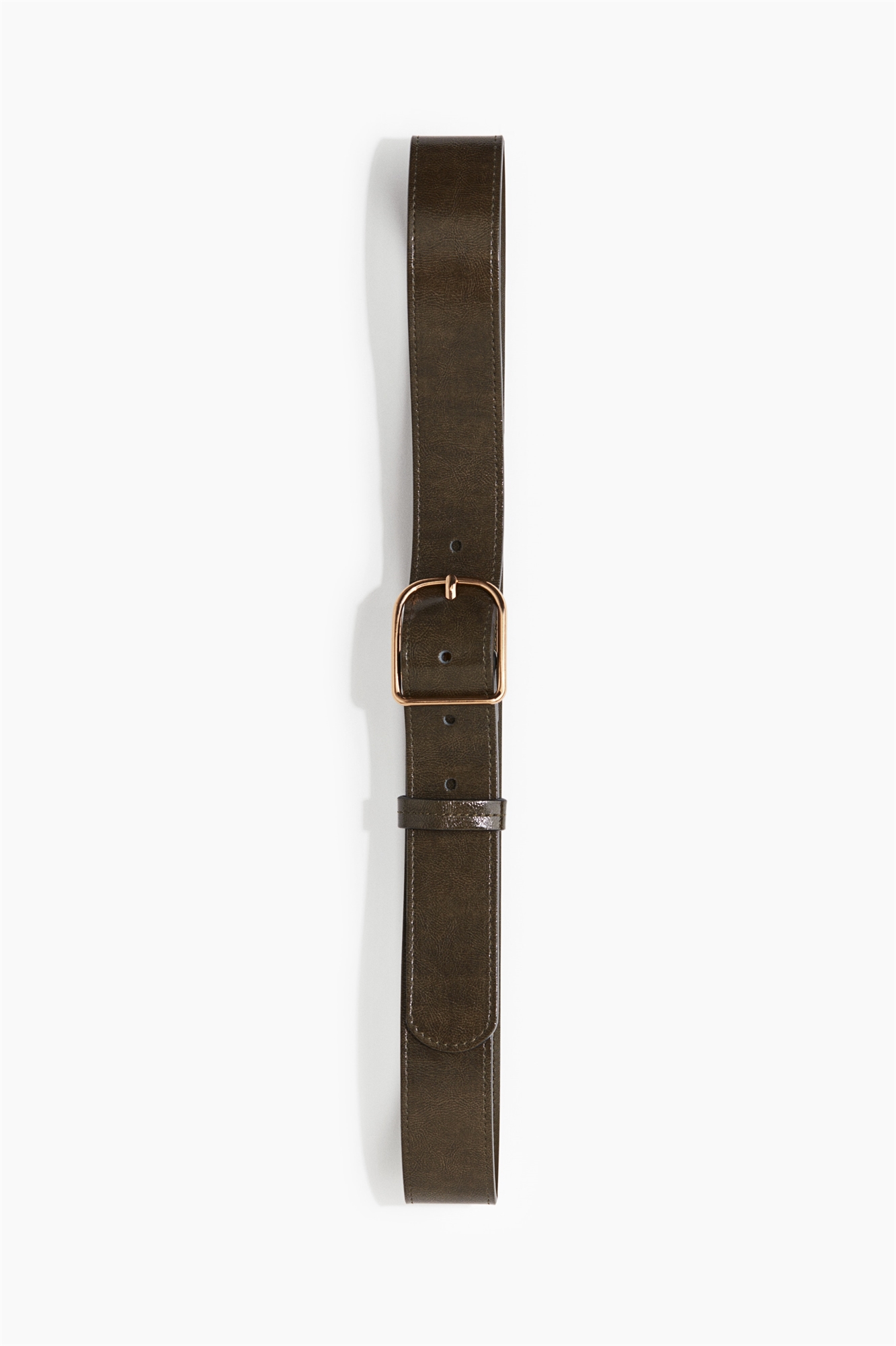 Широкий ремень с узкой металлической пряжкой в форме буквы D.