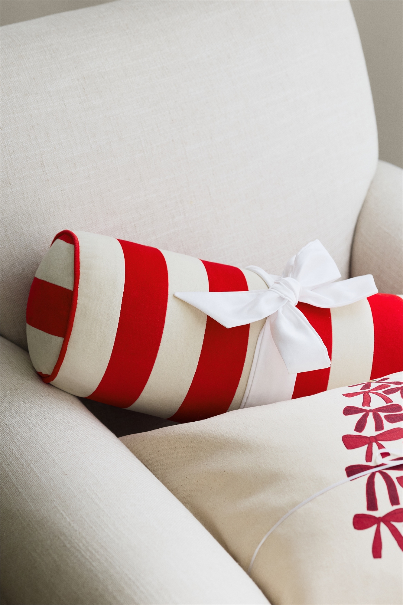 Подушка-болстер из мягкого бархата с широкими полосами и отделкой по бокам. Подушка выполнена в цвете конфетного тростника, что делает ее забавным и праздничным дополнением к вашему дивану на Рождество.