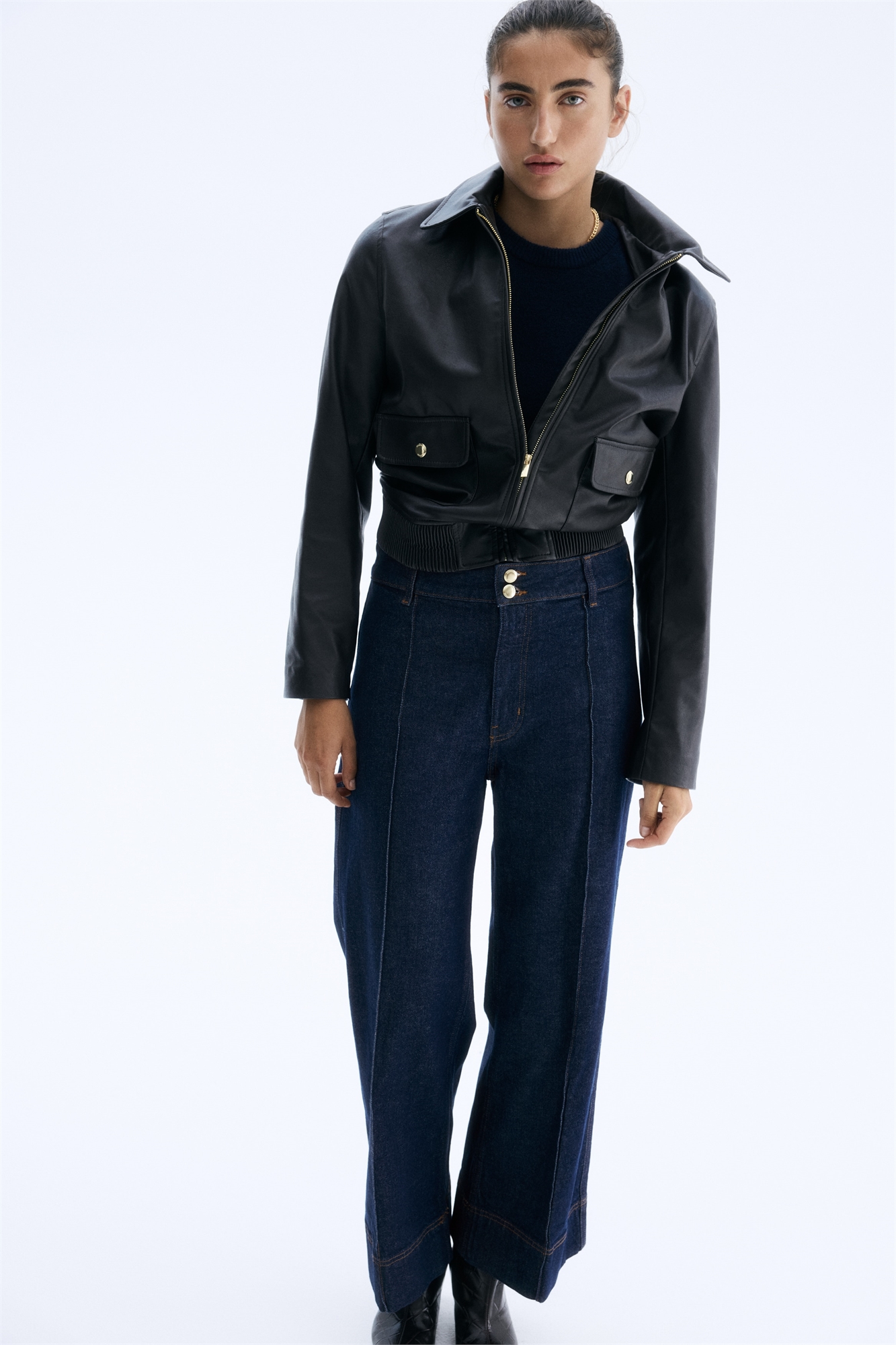 Джинсы из хлопкового денима с легким стретчем для комфорта. Широкие штанины с обычной посадкой от талии до бедер и широким кроем от бедра до подола. Высокая талия, ширинка на молнии и пуговицах. Пришитые складки спереди и накладные задние карманы. Длина по щиколотку, рассчитанная на ношение на лодыжках. Вдохновленные 70-ми, созданные для сегодняшнего дня.