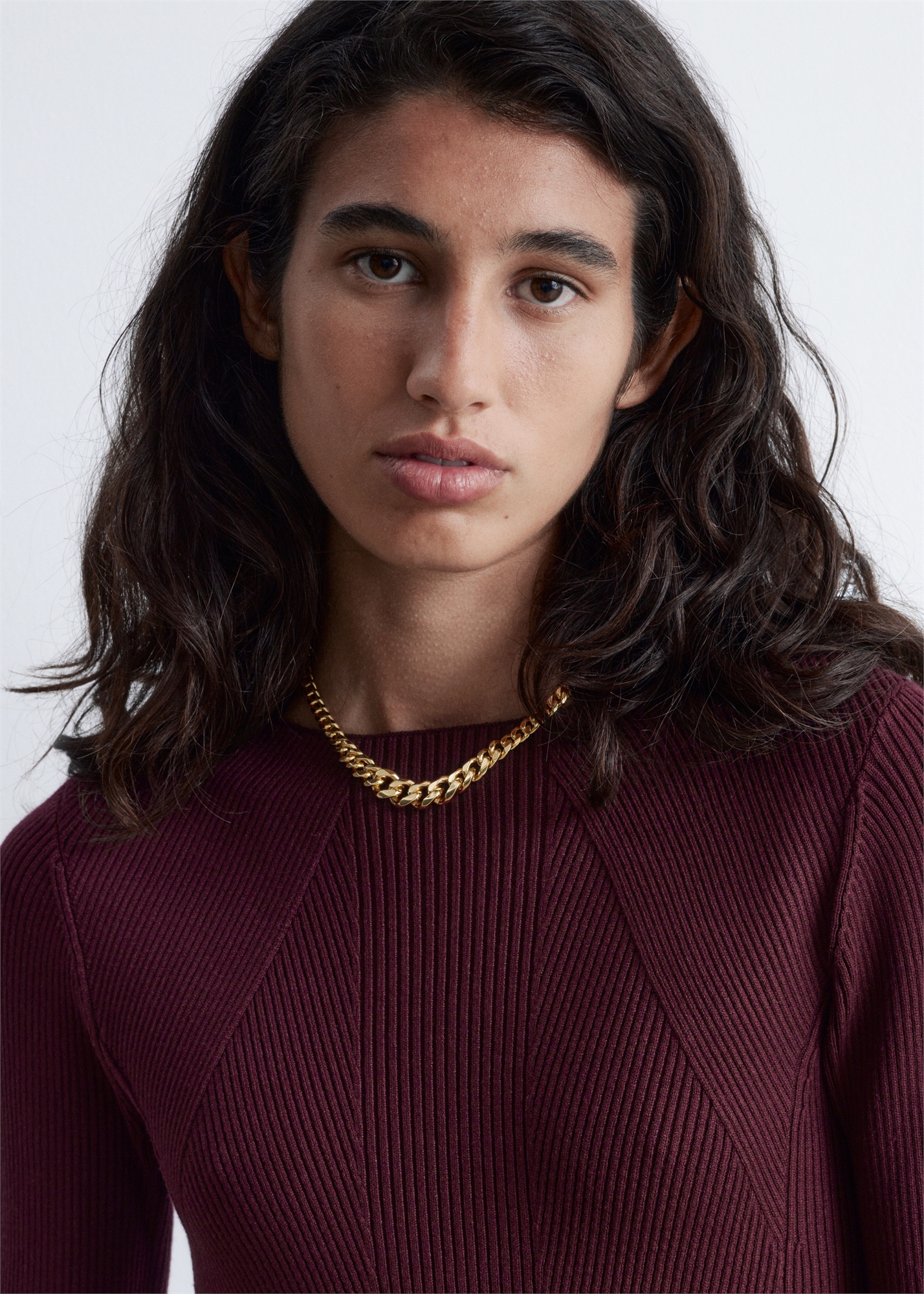 Изготовленное из полированной латуни, это короткое ожерелье состоит из симметричных цепочек, которые становятся более толстыми к середине. Ожерелье имеет регулируемую длину и застежку-триггер. Общая длина: 40 см / 15,7"