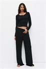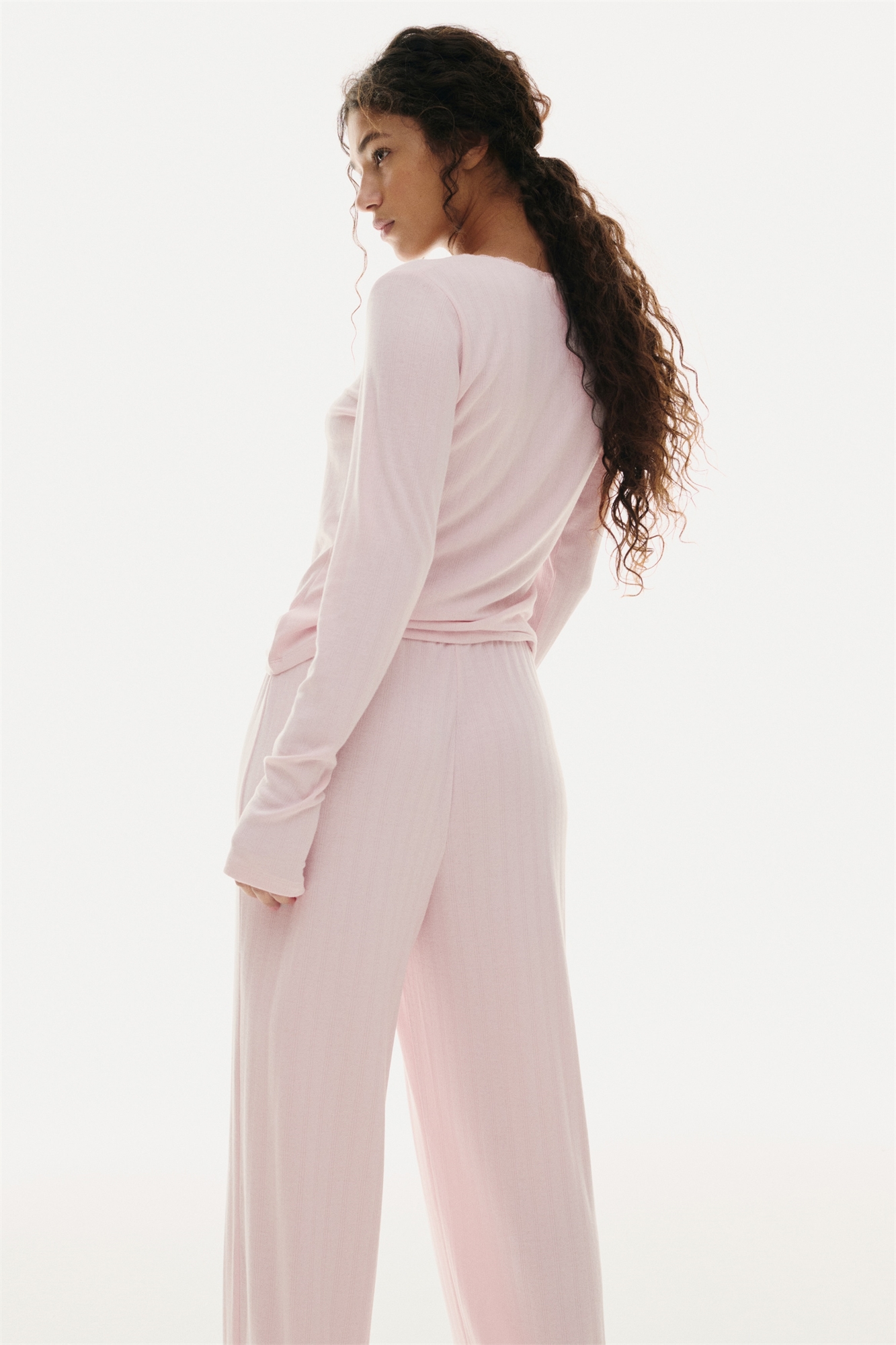 Пижама с верхом и низом из мягкого трикотажа пуантель. Верхняя часть с круглым вырезом с кружевной отделкой, застежкой на пуговицы и длинными рукавами. Низ с эластичным поясом на талии.