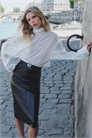 Блузка больших размеров из полотняного переплетения с драпированным воротником-бантом, который завязывается сзади. Спущенные плечи и длинные рукава с манжетами на пуговицах и формирующими выточками спереди и сзади для удлиненной талии.
