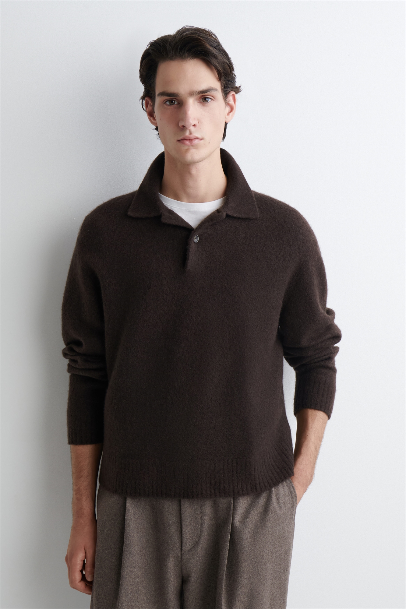 Текстура и ощущения находятся в центре внимания коллекции трикотажа этого сезона. Эта рубашка-поло из шерсти мериноса и шерсти яка имеет матовую поверхность, приятную на ощупь. Носите эту модель с короткой расстегнутой пуговицей поверх футболки. Свободный кройПуговицыВ изделии использованы шерстяные волокна Responsible Wool Standard TE-00047206 (RWS) с ферм, сертифицированных в соответствии с требованиями благополучия животных и сельского хозяйства Внешний материал: 60% мериносовой шерсти, 27% переработанного полиамида (переработанный нейлон), 10% шерсти яка, 3% переработанного эластана. Детали исключены/Сухая чистка Длина по спинке в размере M = 65 см/Модель носит размер M
