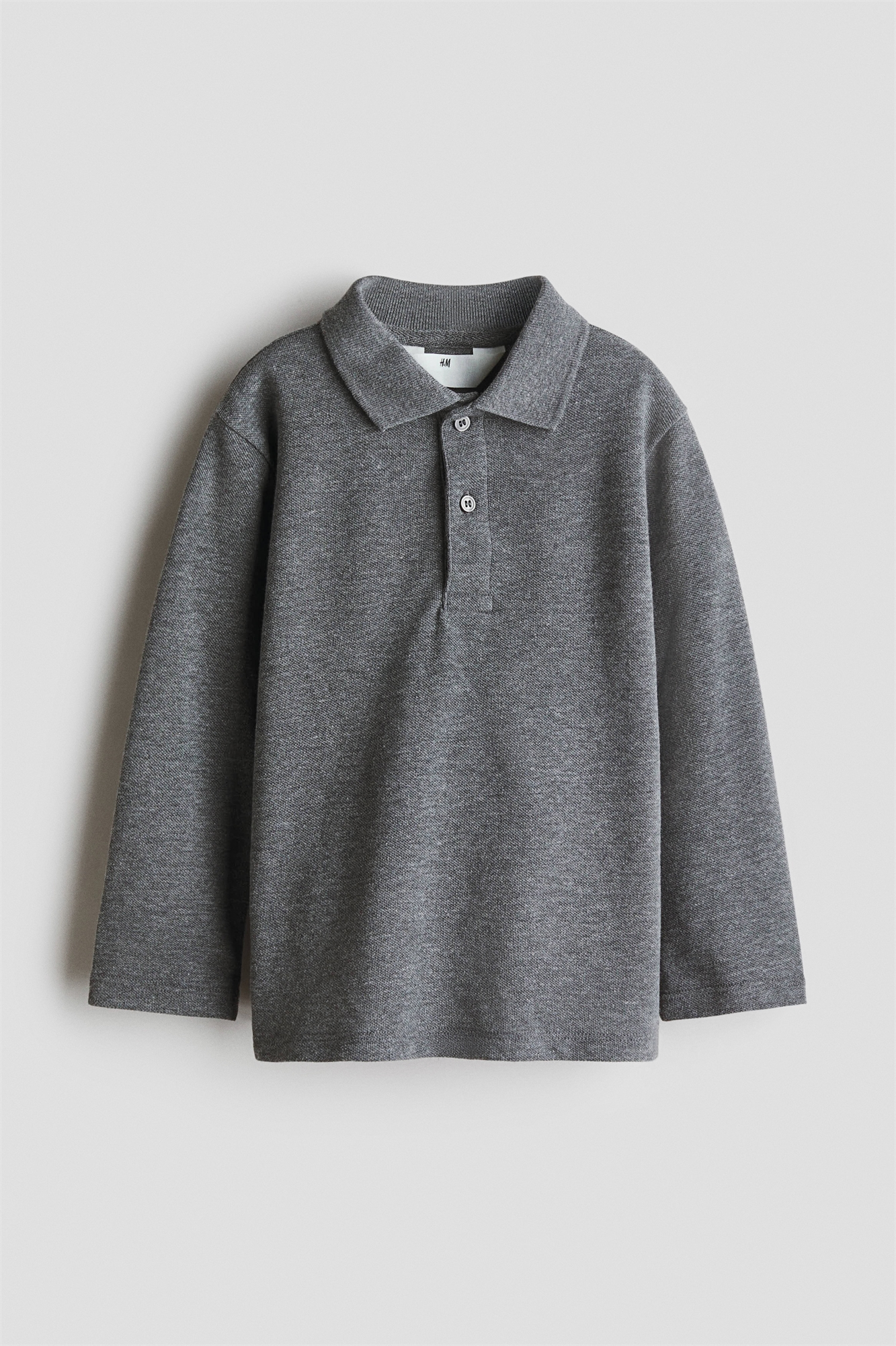 Рубашка-поло из хлопкового пике с ребристым воротником, застежкой на пуговицы и длинными рукавами.
