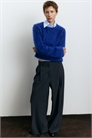 Приталенные брюки свободного кроя из шерстяного микса. Высокая талия и ширинка на молнии с потайными застежками-крючками. Диагональные боковые карманы, втачные задние карманы на пуговице и широкие ноги со складками спереди и складками спереди и сзади.