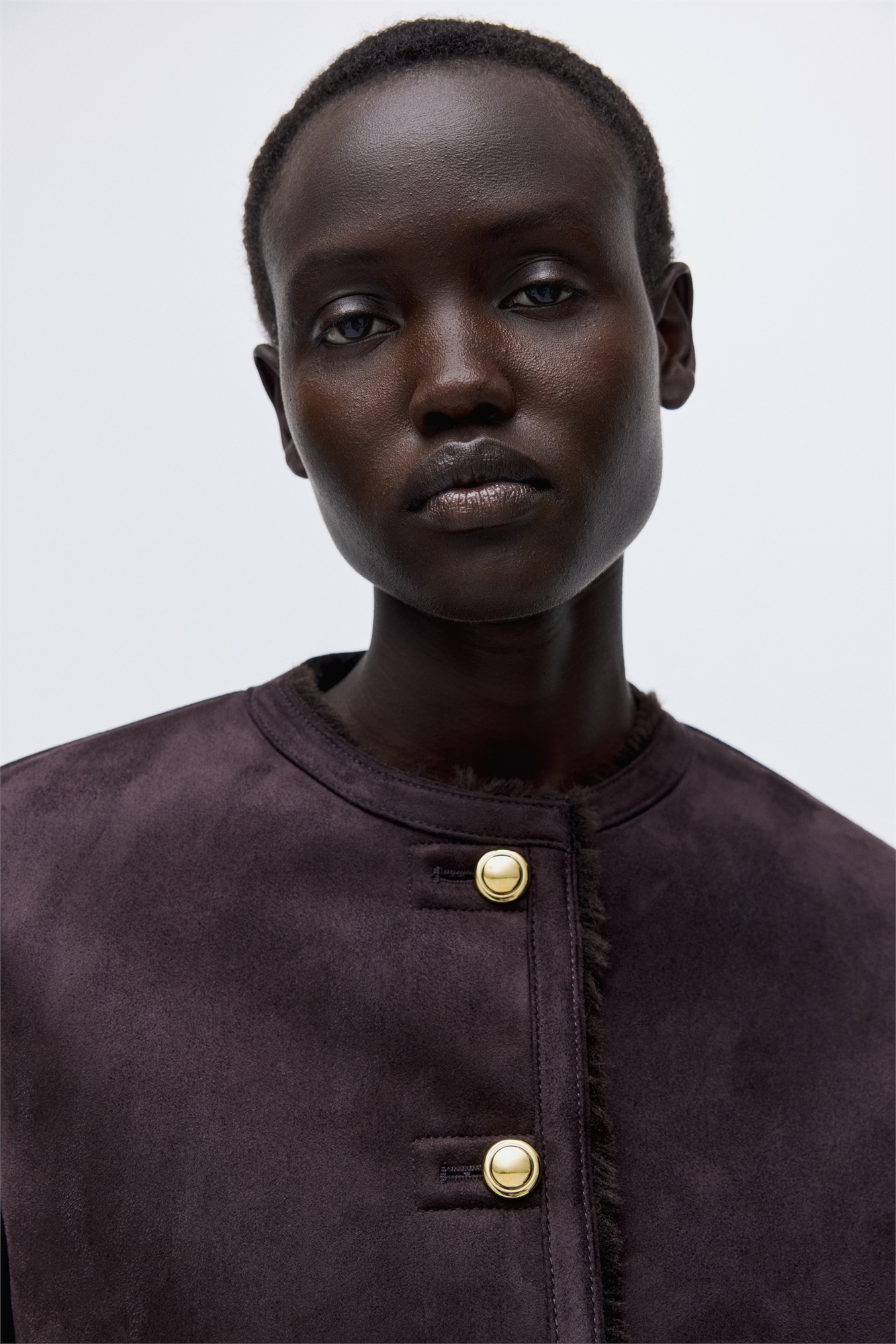 Короткий жакет из тканого материала с мягким ворсом и мягкой ворсовой подкладкой. Круглый вырез, металлические пуговицы спереди и накладные передние карманы с кнопкой.