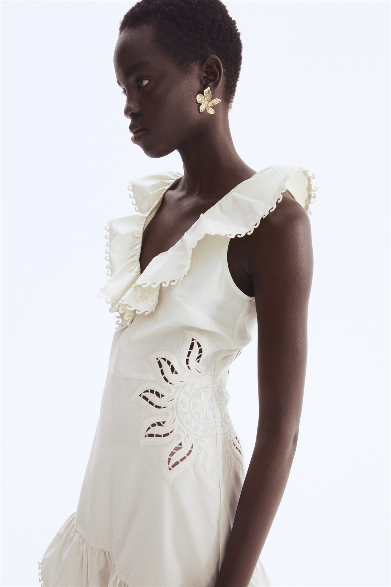 Короткое платье без рукавов из тканого материала, украшенное декоративной отделкой и участками из англо-буржуазной ткани. Глубокий V-образный вырез с широкой оборкой, потайная застежка-молния и застежка-крючок сзади, подол с оборкой. Без подкладки.