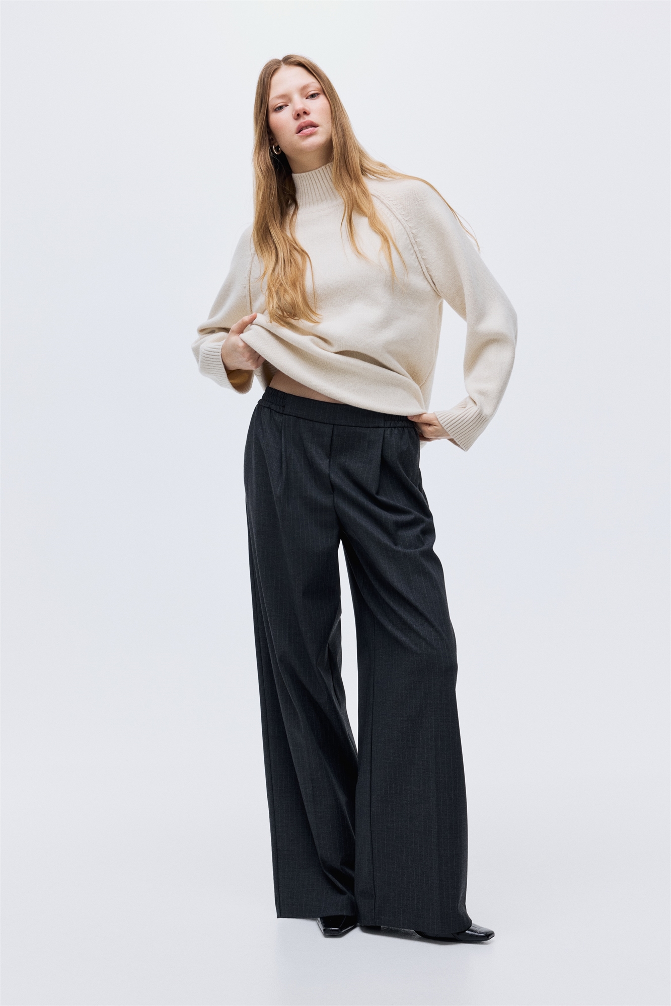 Свободные брюки из тканого материала с высокой талией, эластичным швом и искусственной ширинкой. Небрежные боковые карманы, фальшивый накладной карман сзади и широкие ноги со складками спереди и складками спереди и сзади.