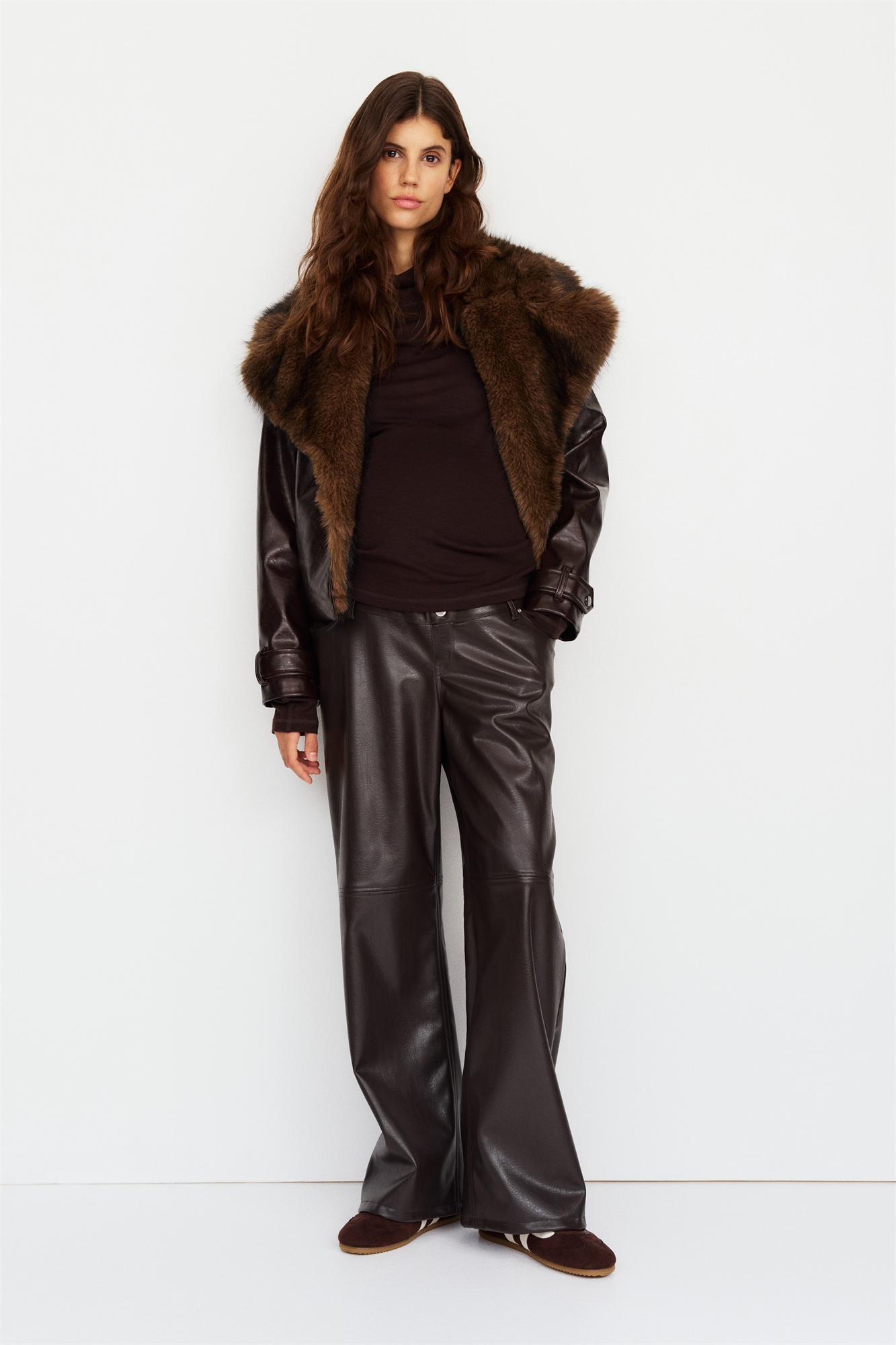 Брюки с 5 карманами, эластичной отделкой по бокам и широкой панелью из джерси на талии для лучшей посадки на животе. Фальшивая ширинка с пуговицей и прямые ноги с горизонтальным швом на коленях.