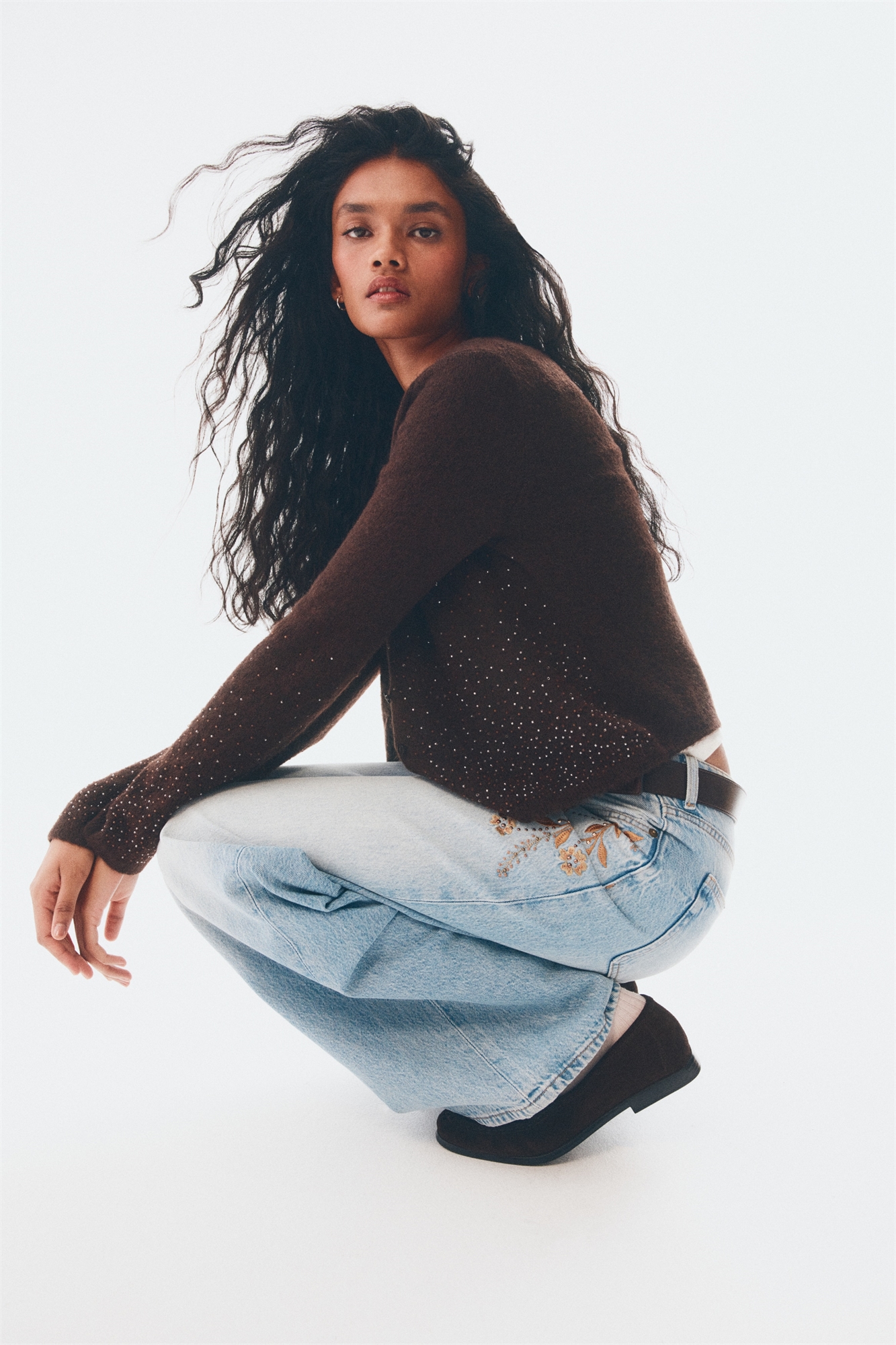 Джинсы с 5 карманами из жесткого хлопкового денима, который сначала кажется упругим, но затем смягчается и ослабевает по мере носки. Широкие штанины с обычной посадкой от талии до бедер и широким кроем от бедра до подола. Завышенная талия, ширинка на молнии и пуговице, а также вышитые мотивы спереди. Обычная длина, рассчитанная на то, чтобы практически не мешать. Широкий силуэт, который всегда выглядит привлекательно.