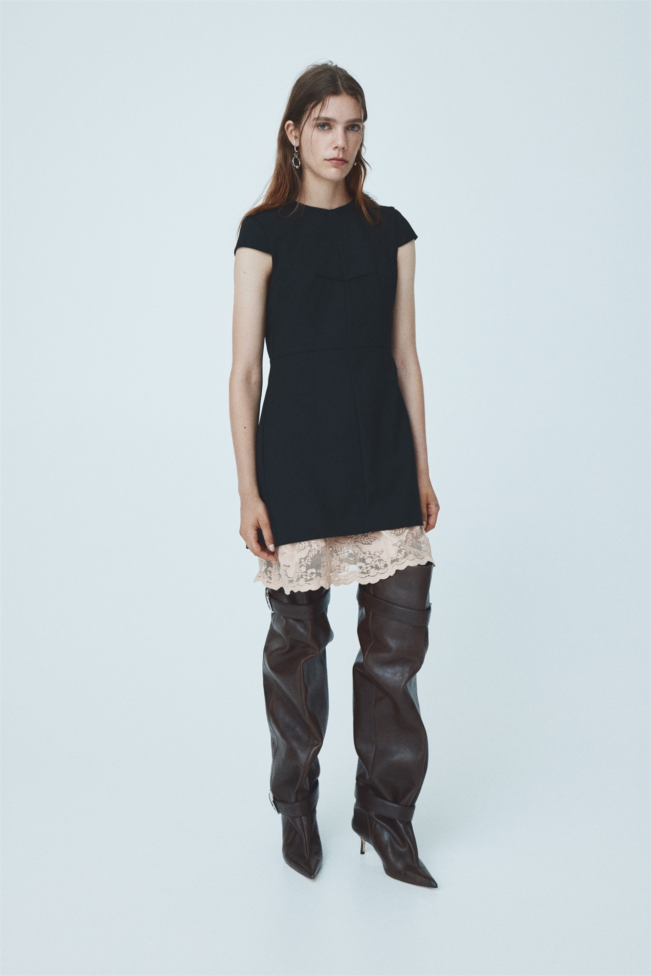 Облегающее мини-платье в два слоя. Внешнее платье выполнено из шерстяной смеси с необработанными краями. Оно имеет круглый вырез, рукава-шапочки и открытую спину с потайной застежкой в верхней части и широкими завязками на талии. Внутреннее платье из вискозной саржи без рукавов с круглым вырезом и открытой застежкой-молнией сзади. Оба слоя имеют открытые вытачки на талии и бюсте в качестве стильной изюминки.