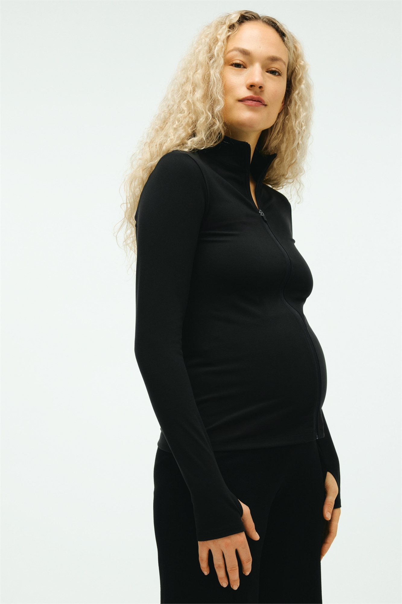 Спортивная куртка из быстросохнущей функциональной ткани, разработанная для того, чтобы сохранить сухость и прохладу во время занятий спортом. Облегающий крой с воротником-стойкой, застежка-молния спереди и удлиненные рукава с отверстиями для больших пальцев.