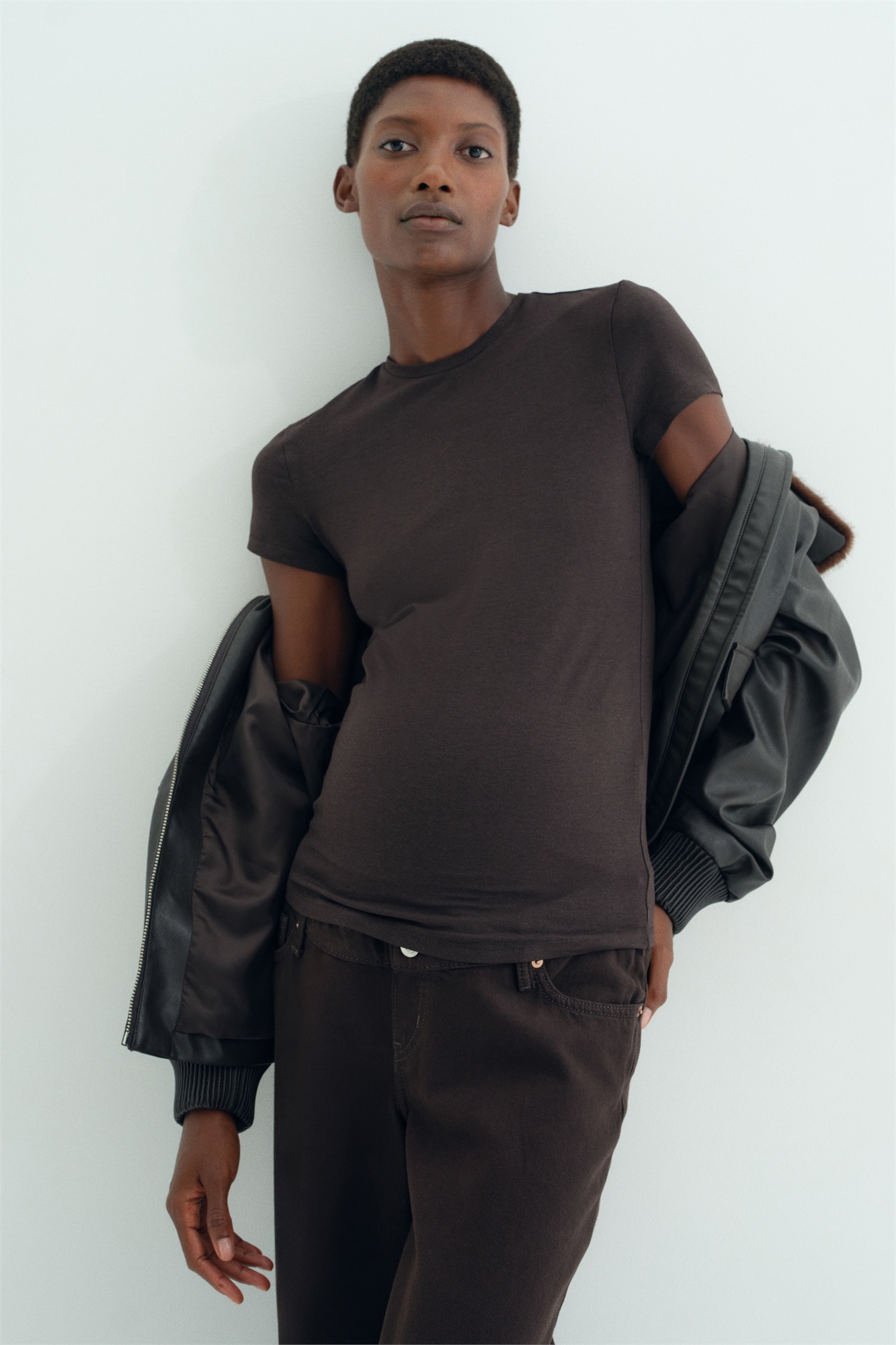 Облегающая футболка из мягкого хлопка и вискозного джерси с круглым вырезом и узкой окантовкой.