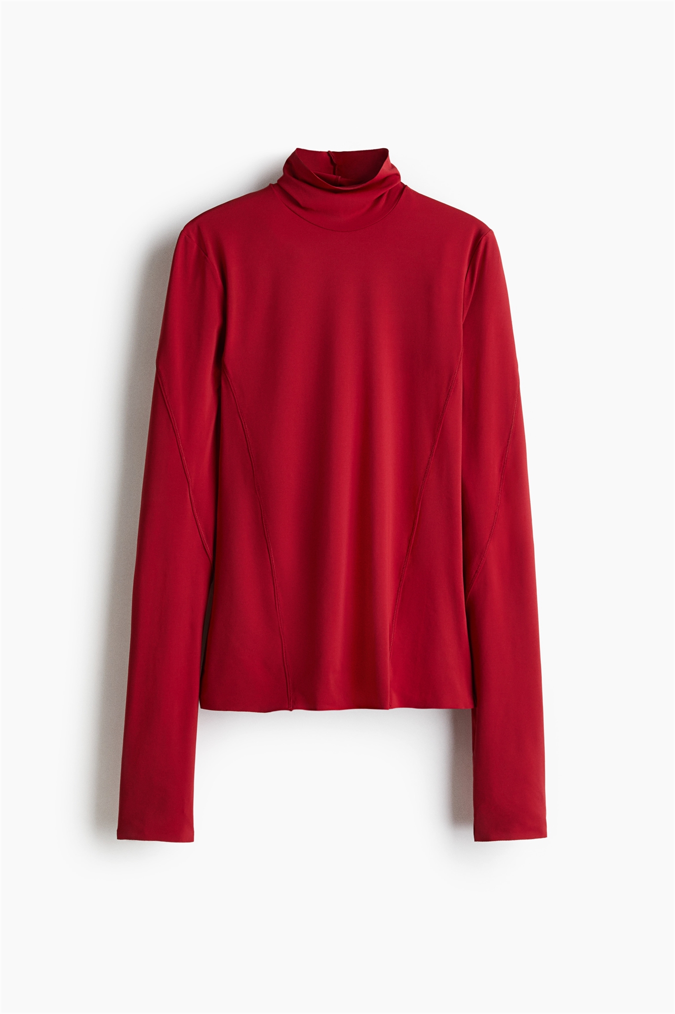 Облегающий топ из мягкого джерси-стрейч с лазерной обработкой краев. Черепаховая горловина и очень длинные, плотно прилегающие рукава. Боковые швы, направленные вперед, и шов "ярмо", который проходит сзади по рукавам и подчеркивает облегающий силуэт.