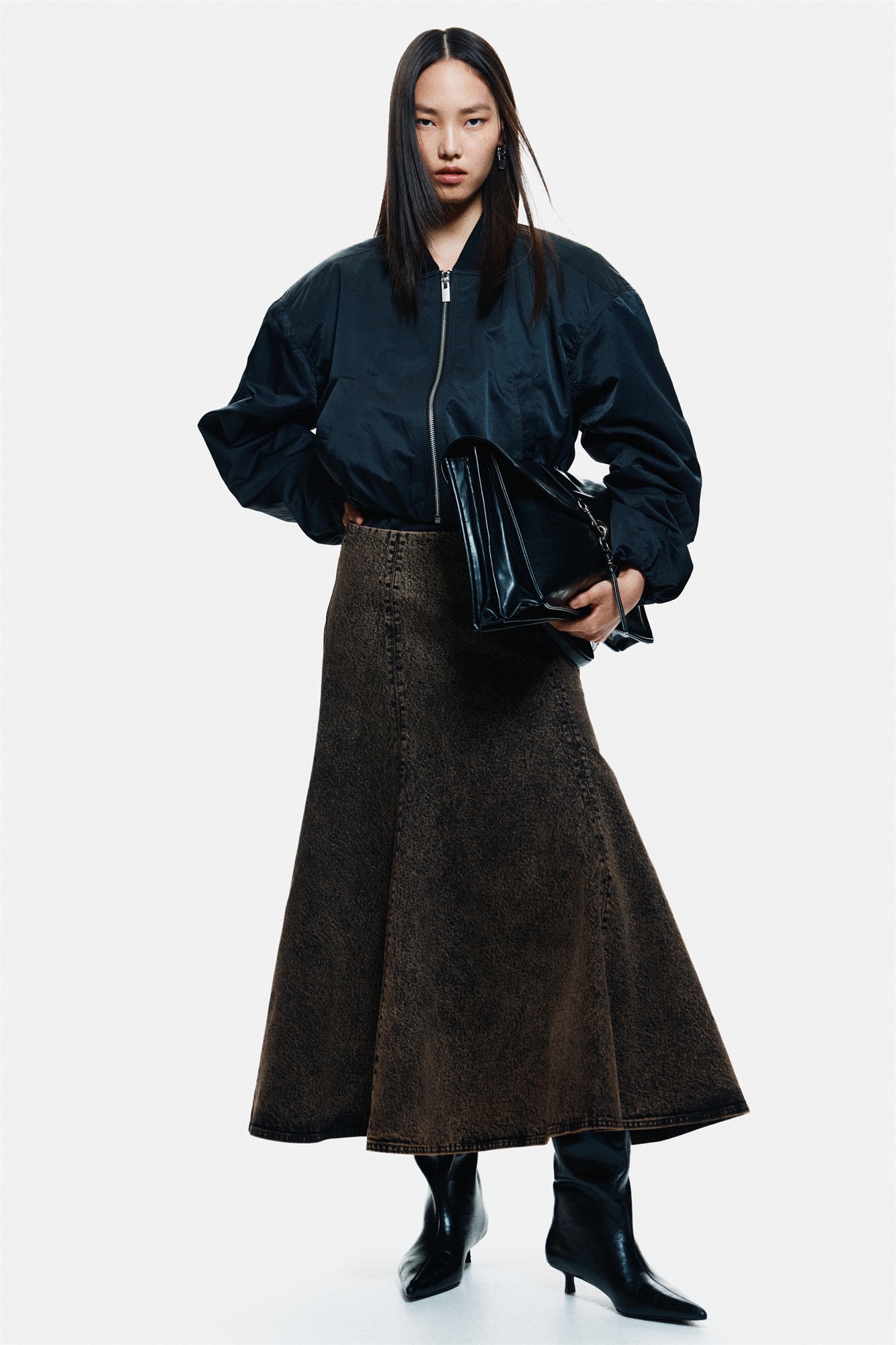 Юбка длиной до щиколоток из жесткого хлопкового денима с расклешенным силуэтом. Регулярная талия с потайной застежкой-молнией с одной стороны.