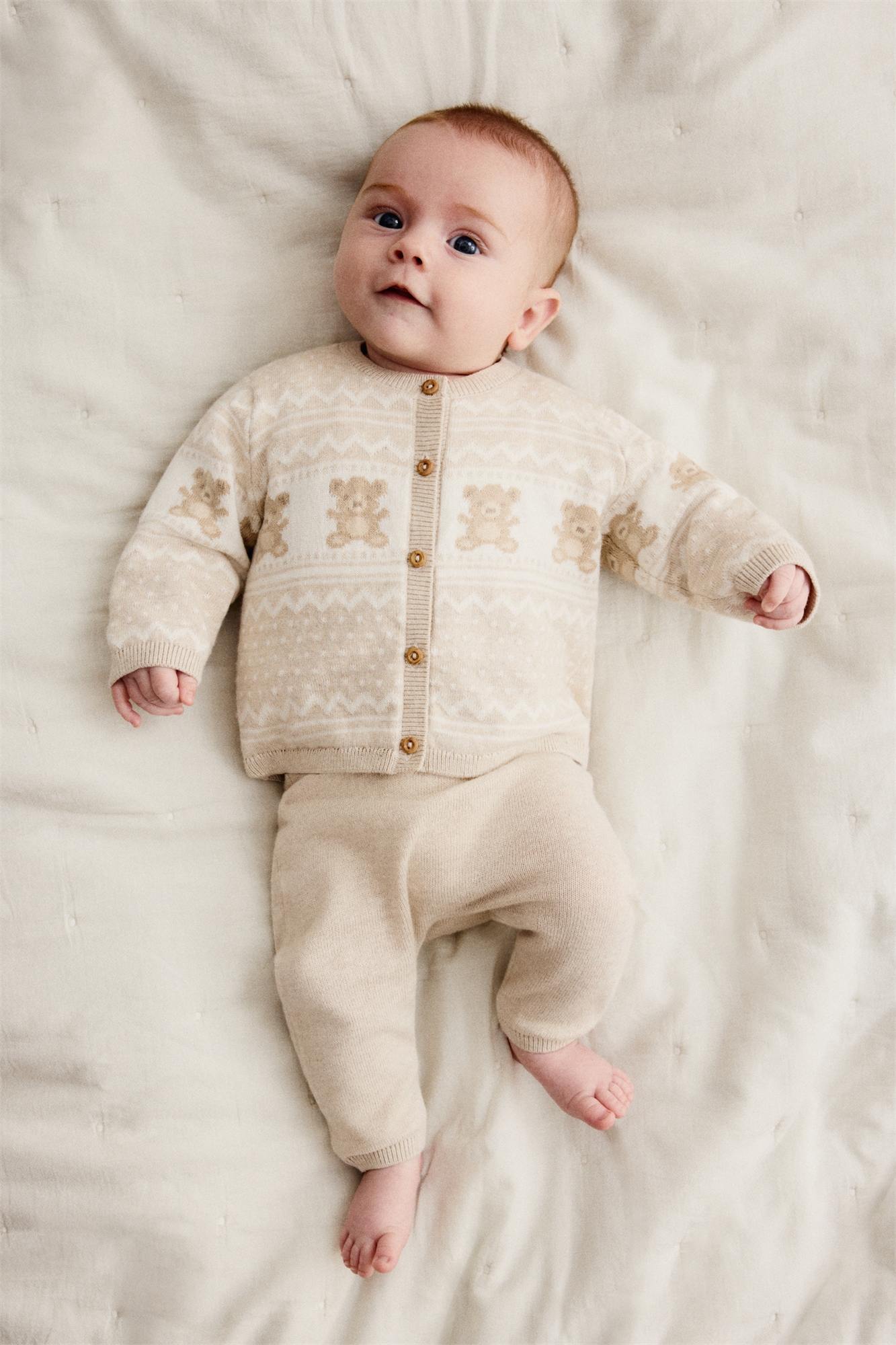 Комплект из кардигана и брюк из мягкого хлопка тонкой вязки. Кардиган с узорчатой вязкой, круглым вырезом, пуговицами спереди и тесемками по краям. Брюки с эластичной резинкой на талии и тесемками по краям.