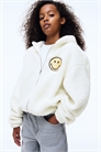 Толстовка свободного покроя из мягкого тедди с вышитыми мотивами спереди и сзади. Капюшон с подкладкой из джерси, застежка-молния спереди, спущенные плечи и эластичные манжеты и подол.