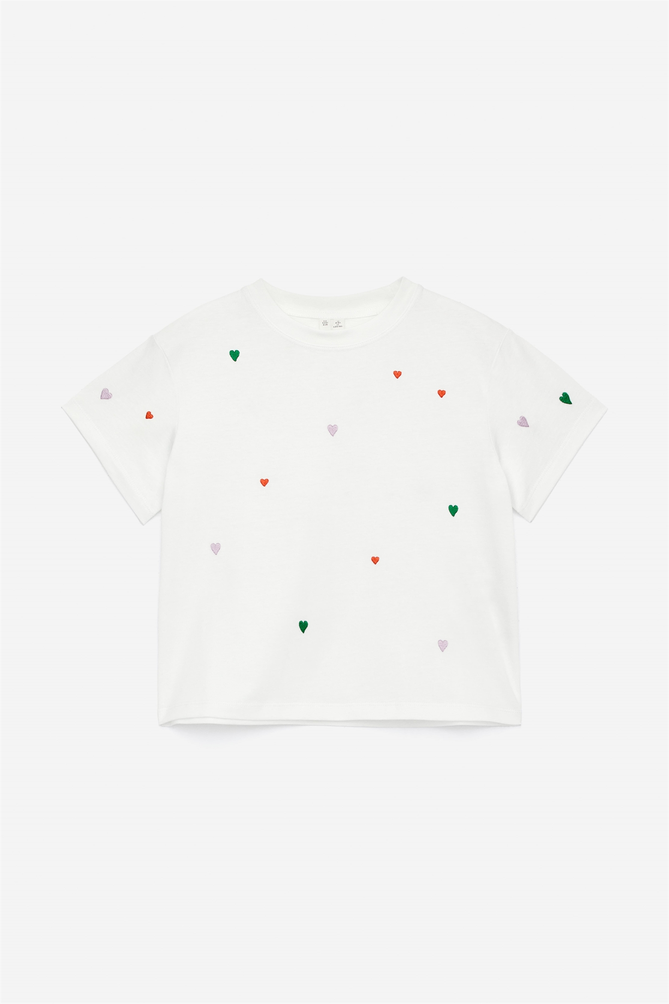 Гладкая футболка широкого покроя со слегка спущенными плечами. Она изготовлена из хлопкового джерси и украшена вышивкой по всей поверхности. Ребристый вырез.