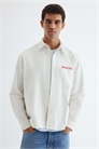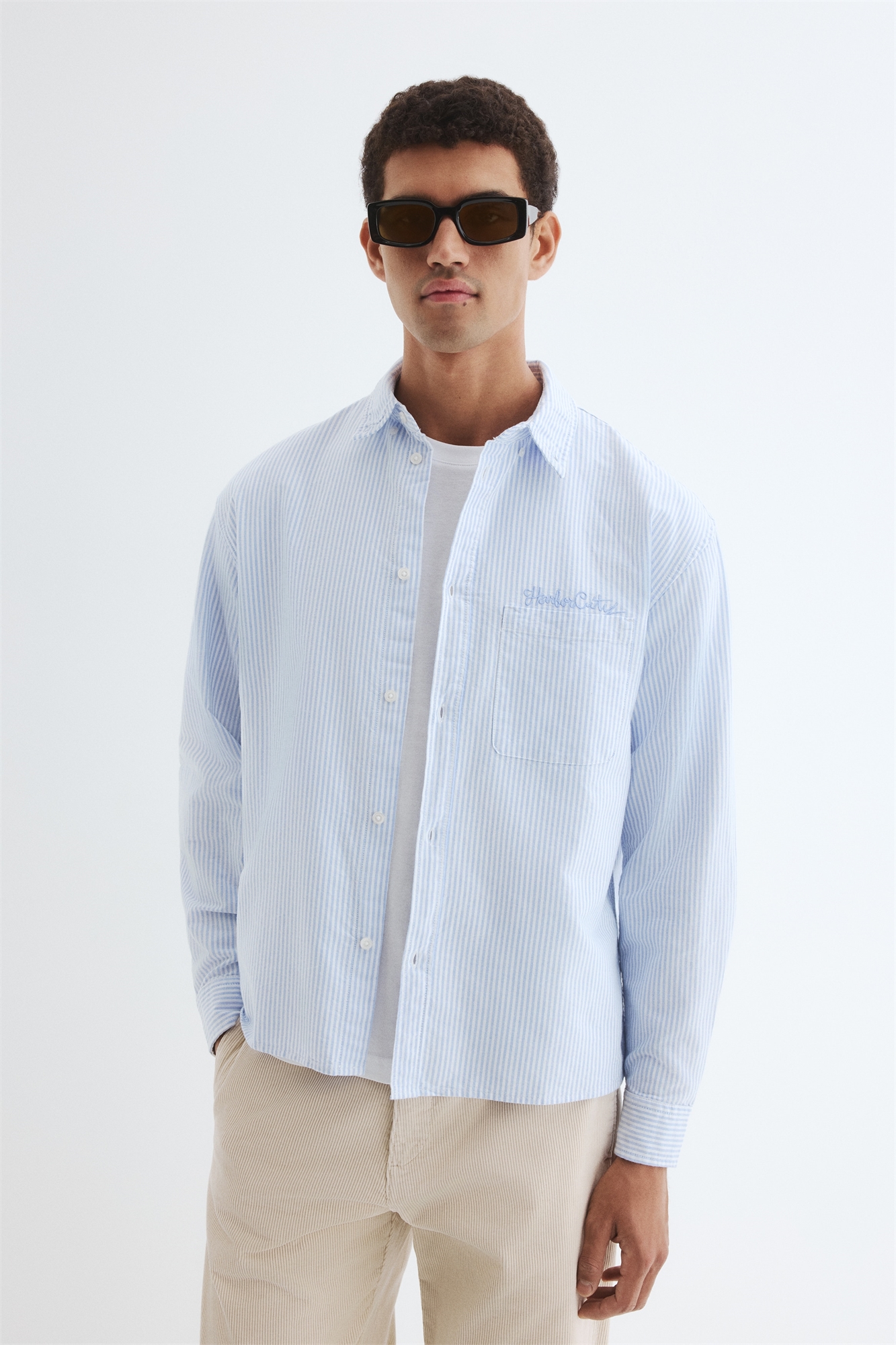 Рубашка оксфордского плетения из хлопковой смеси. Воротник на пуговицах, классический перед и задний яр с петлей для вешалки. Открытый нагрудный карман и вышитый текстовый мотив на груди. Длинные рукава, манжеты на пуговицах, застежка на пуговицах и прямой подол. Свободный крой для пышного, но не чрезмерно большого силуэта.