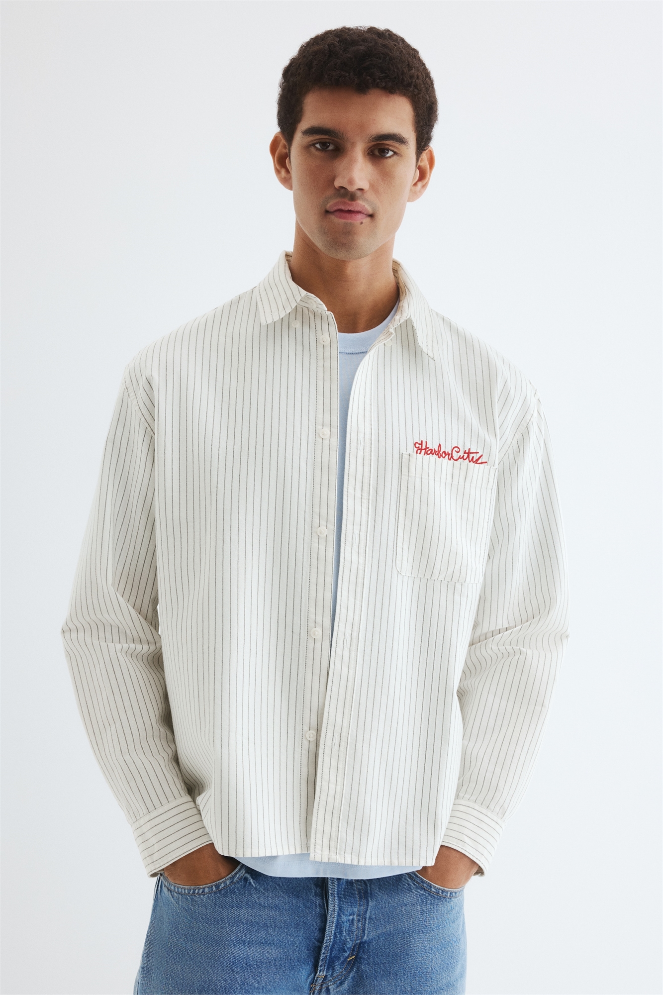 Рубашка оксфордского плетения из хлопковой смеси. Воротник на пуговицах, классический перед и задний яр с петлей для вешалки. Открытый нагрудный карман и вышитый текстовый мотив на груди. Длинные рукава, манжеты на пуговицах, застежка на пуговицах и прямой подол. Свободный крой для пышного, но не чрезмерно большого силуэта.