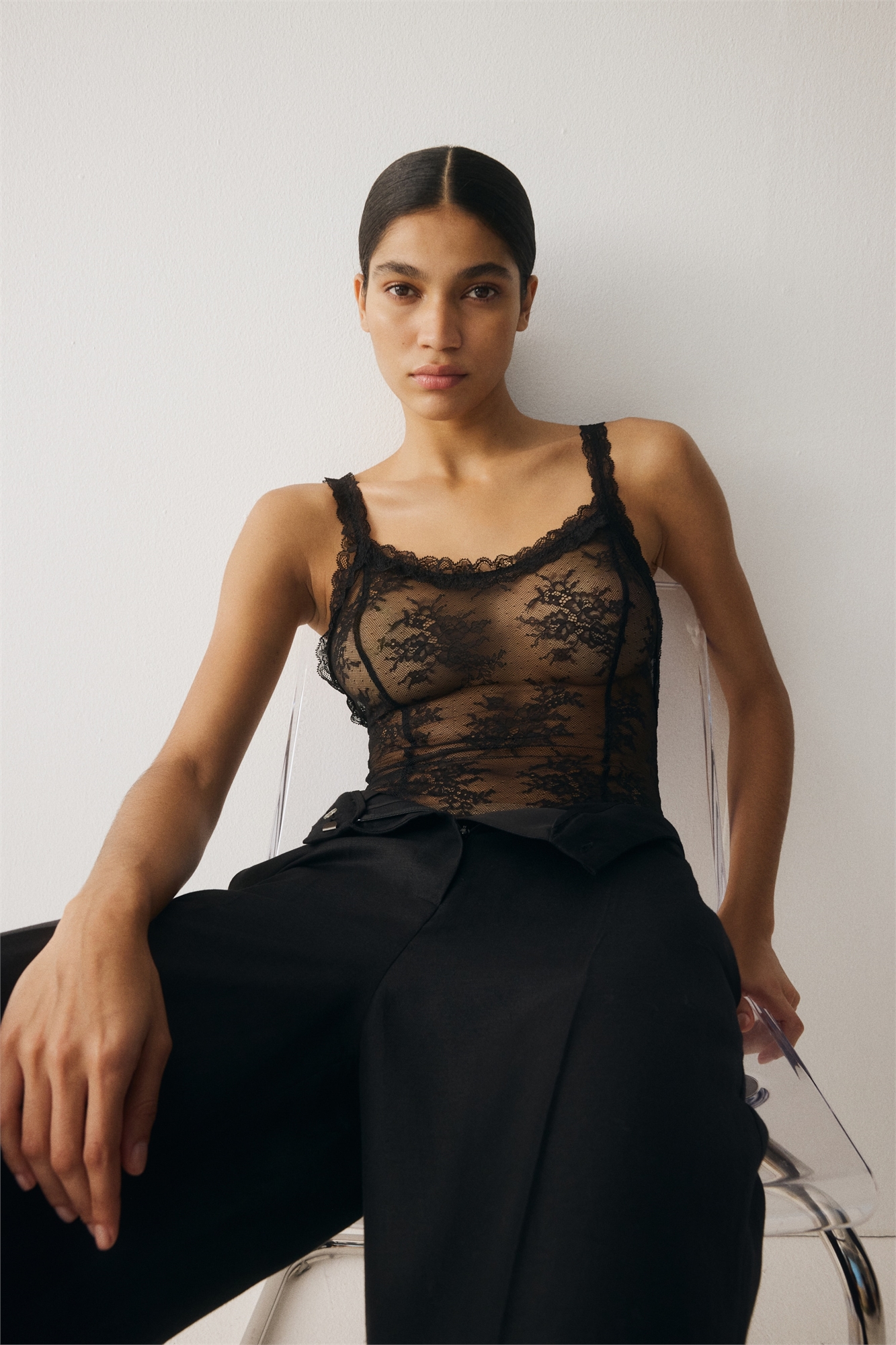 Боди стринги из кружева с широкими бретелями и низким вырезом сзади. Ластовица на подкладке с потайными кнопками.