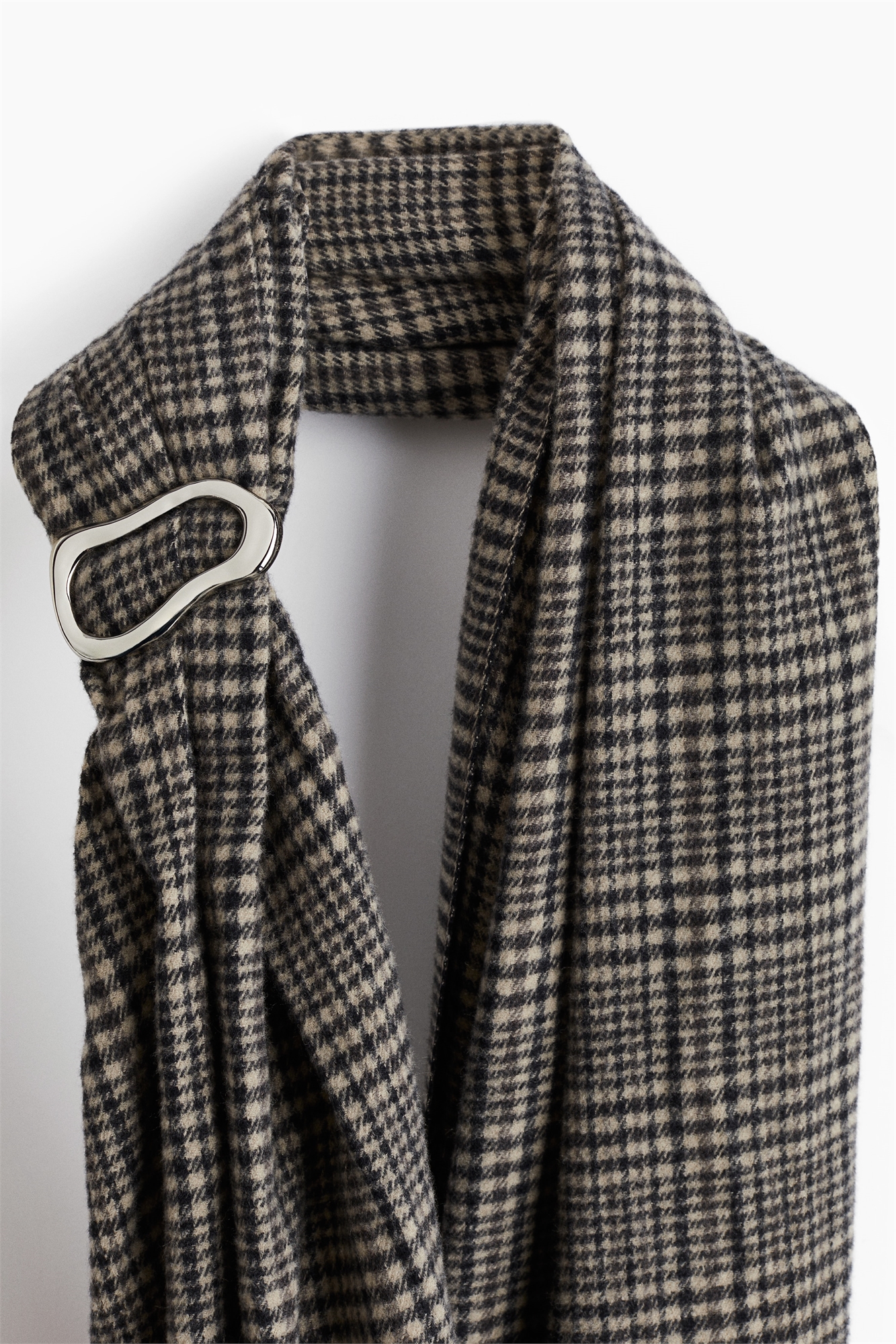 Большой шарф мягкого плетения с матовой поверхностью, крученой бахромой по коротким сторонам и металлической брошью для придания стиля.