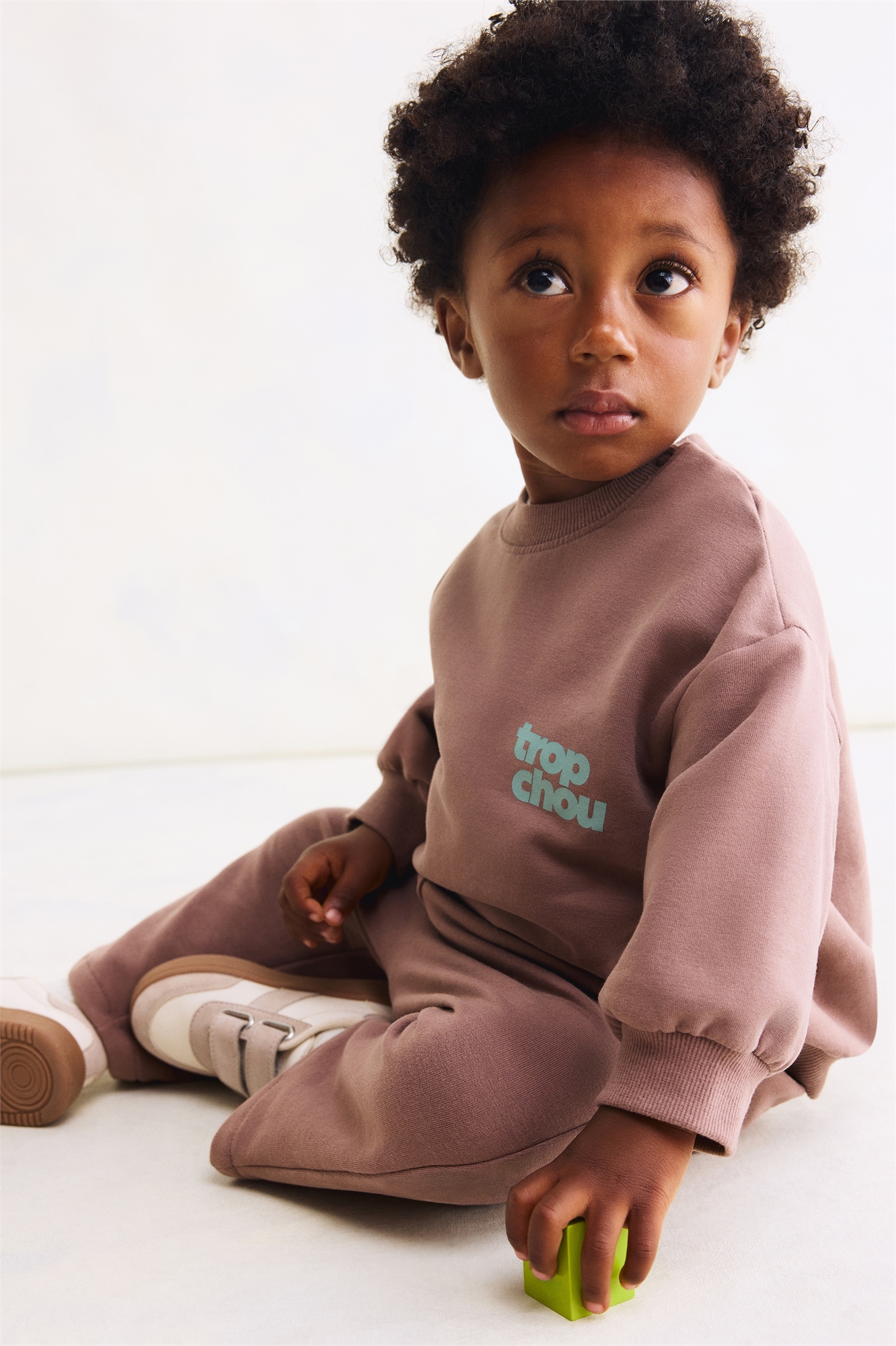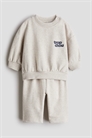 H&M Adorables. Комплект из топа и джоггеров из легкой хлопковой толстовки с мягкой ворсистой изнанкой. Топ с принтом спереди, круглым вырезом с ребристой отделкой и застежками с одной стороны (кроме размеров 2-4Y), спущенными плечами и окантовкой манжет и подола. Джоггеры с эластичным поясом на завязках, открытым задним карманом и прямыми ногами. Коллекция H&M Adorables - это подборка удобных и качественных вещей, не теряющих актуальности.