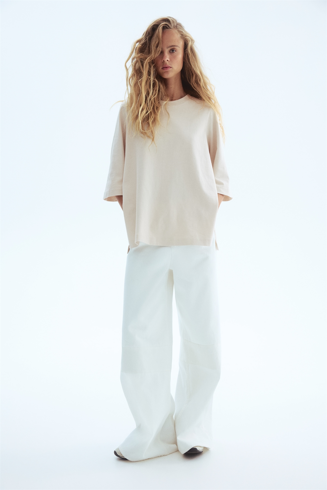 Длинная футболка большого размера из плотного хлопкового джерси с горловиной и рукавами, заканчивающимися чуть ниже локтей.
