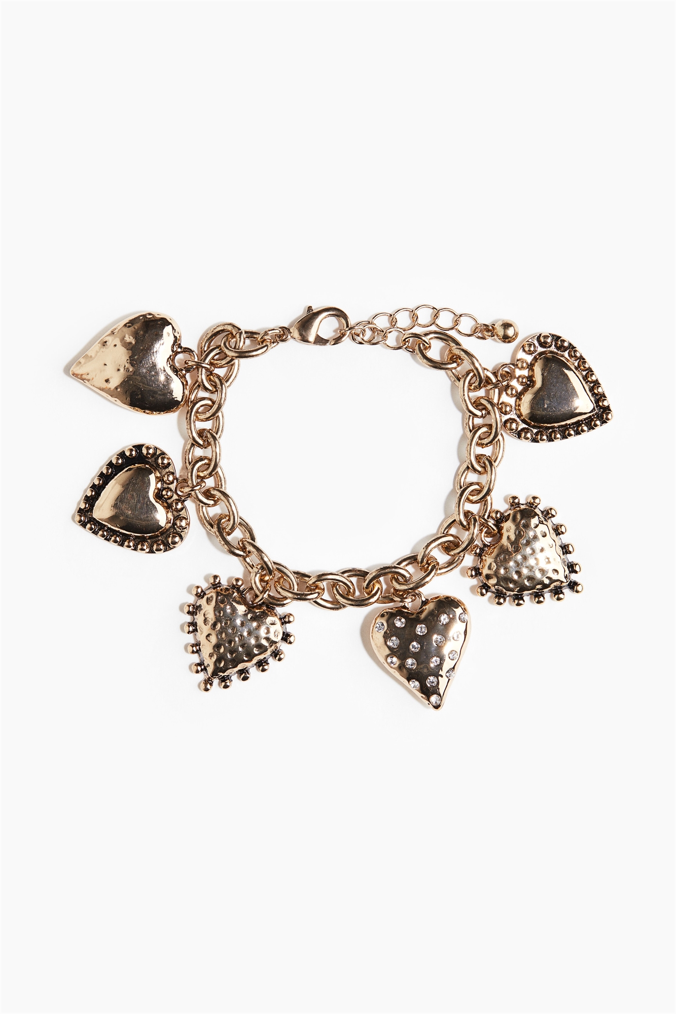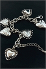 Металлический браслет-цепочка, украшенный шармами в форме сердца с различным дизайном. Регулируемая длина с застежкой-триггером.