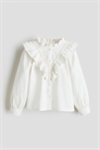 Блузка из мягкого хлопкового полотна с деталями из английской парчи. Небольшой воротник с оборками и V-образный вырез с декоративным воланом. Пуговицы спереди и длинные объемные рукава с манжетами на пуговицах.