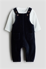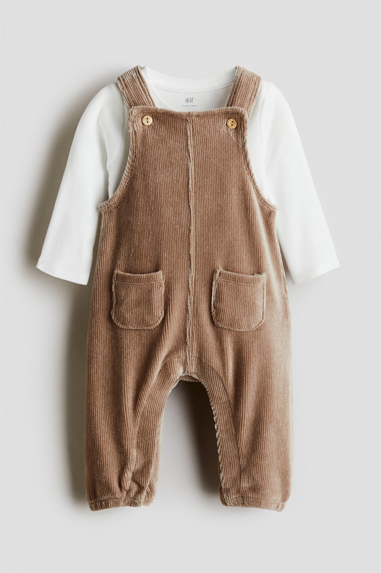 Комплект из полукомбинезона из мягкого вельвета и боди из хлопкового трикотажа. Полукомбинезон с квадратным вырезом горловины, бретелями с регулируемой застежкой и накладными передними карманами. Потайные застежки по ногам для удобства переодевания и узкая эластичная резинка по краям. Боди с длинными рукавами, круглым вырезом и застежками на плечах и внизу для удобства переодевания.