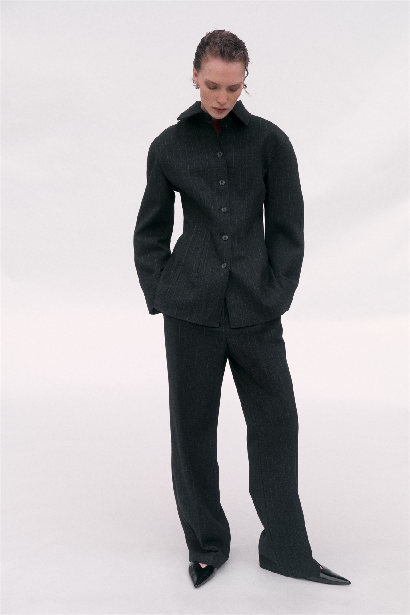 Приталенные брюки из тканого материала с удлиненным поясом и ширинкой на молнии с потайной застежкой на пуговицу и крючок. Диагональные боковые карманы, втачные задние карманы и прямые ноги со складками спереди и сзади.