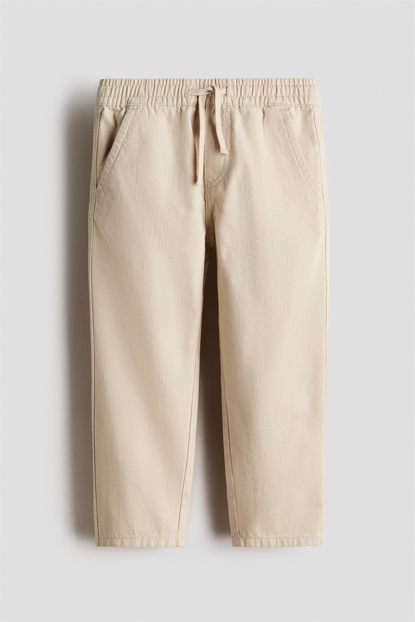 Брюки из мягкой хлопковой саржи с эластичной отделкой, утягивающим поясом на талии, фальшивой ширинкой, диагональными боковыми карманами и накладными задними карманами. Свободный крой с зауженными ногами.